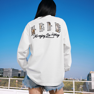 MEDM黑白纯色火烧蕾丝圆领宽松长袖 潮牌百搭情侣休闲上衣 T恤新品