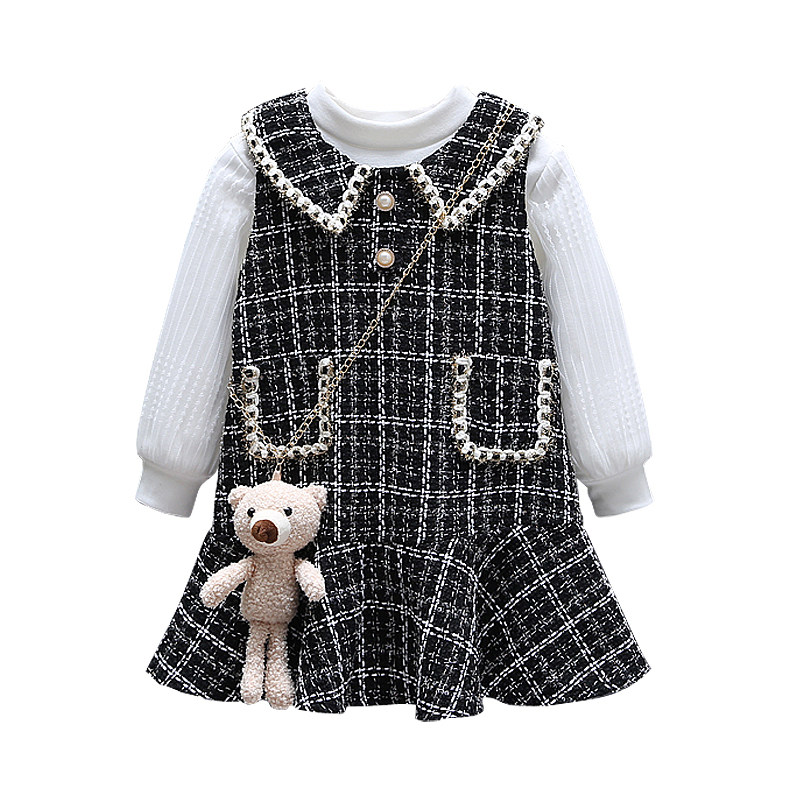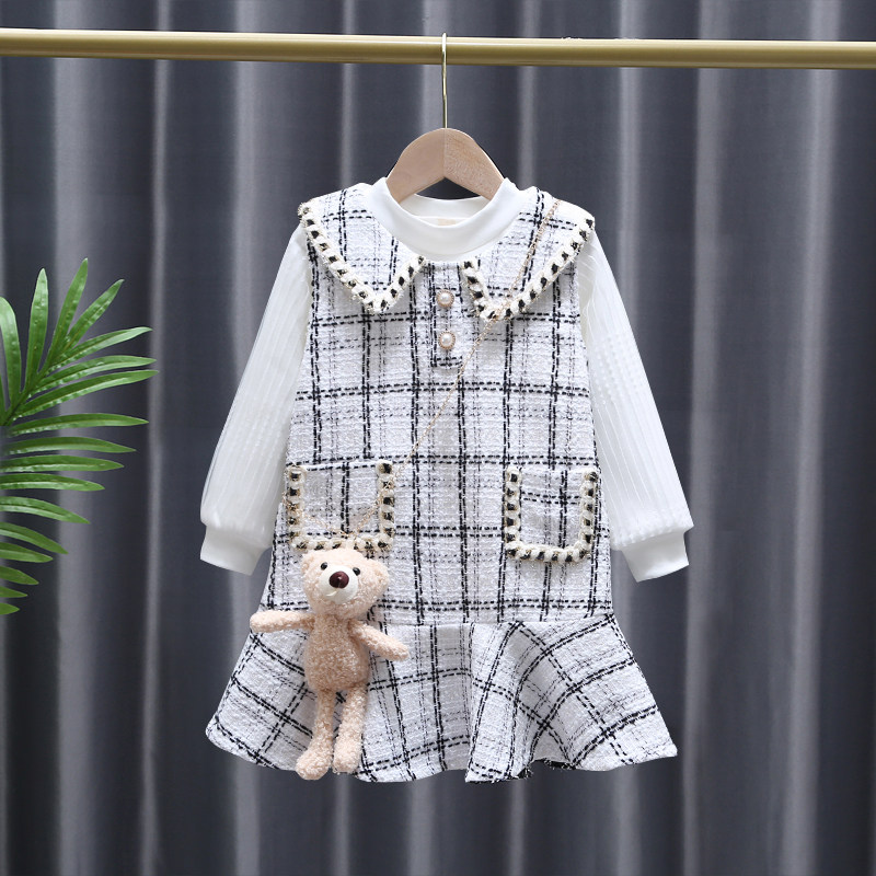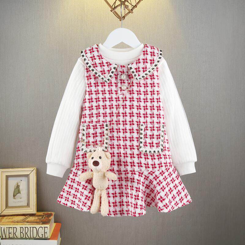 裙子 女童小香风公主裙秋冬两件套宝宝背心裙加绒格子连衣裙jk套装