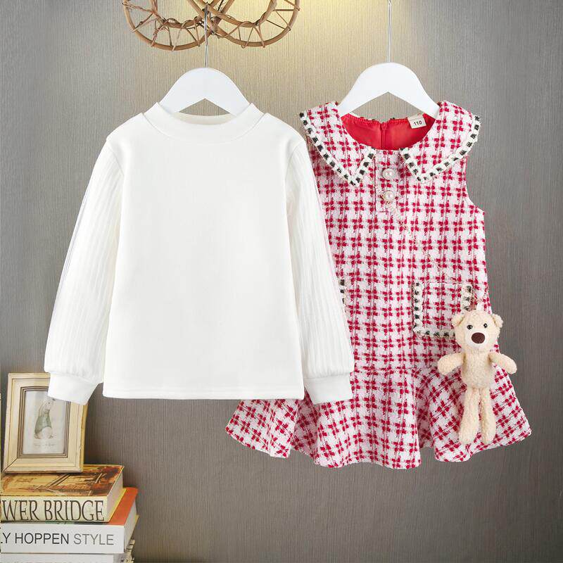 裙子 女童小香风公主裙秋冬两件套宝宝背心裙加绒格子连衣裙jk套装由