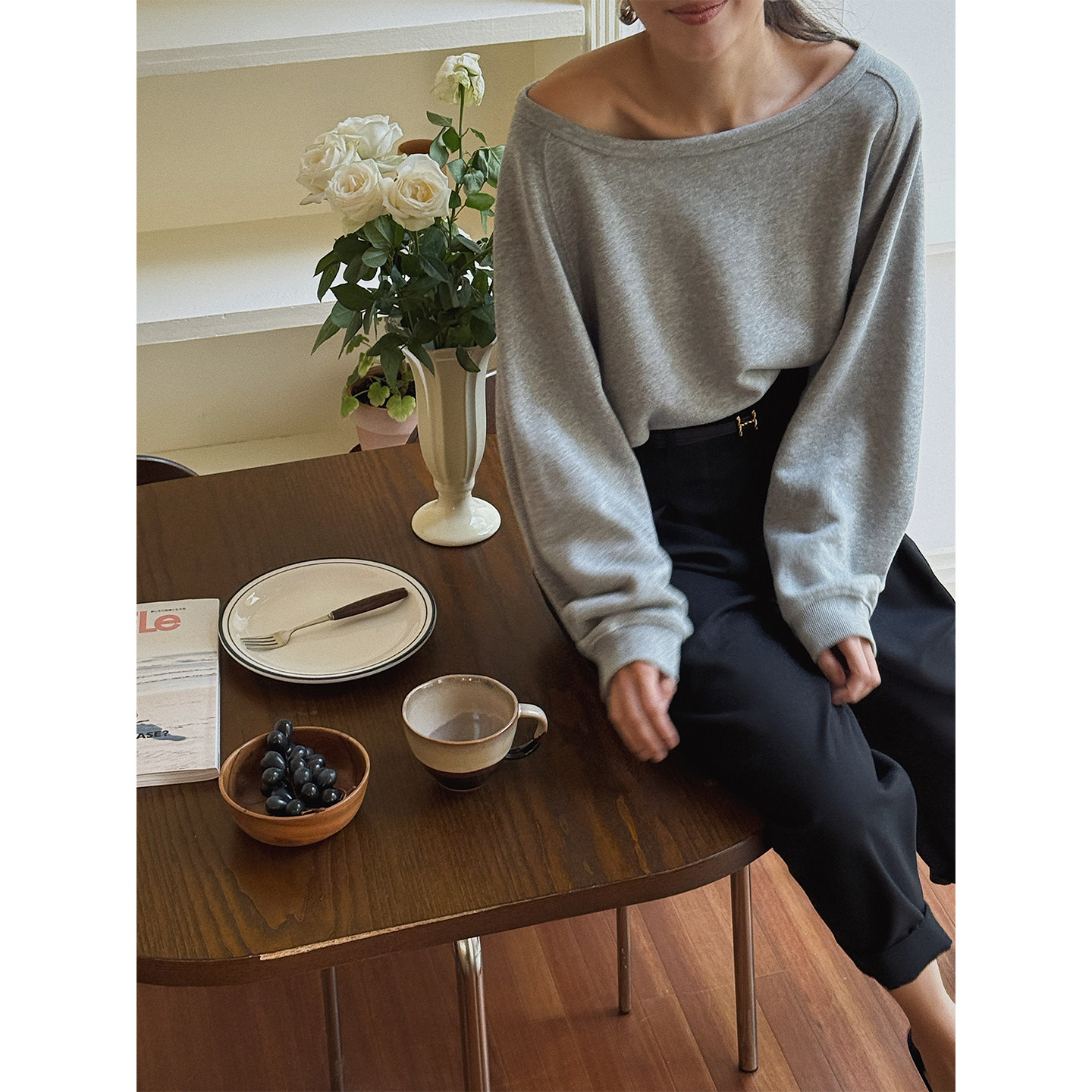 长袖 套头100%面内搭打底卫衣 时髦一字领露肩宽松慵懒短款 SOTHEA