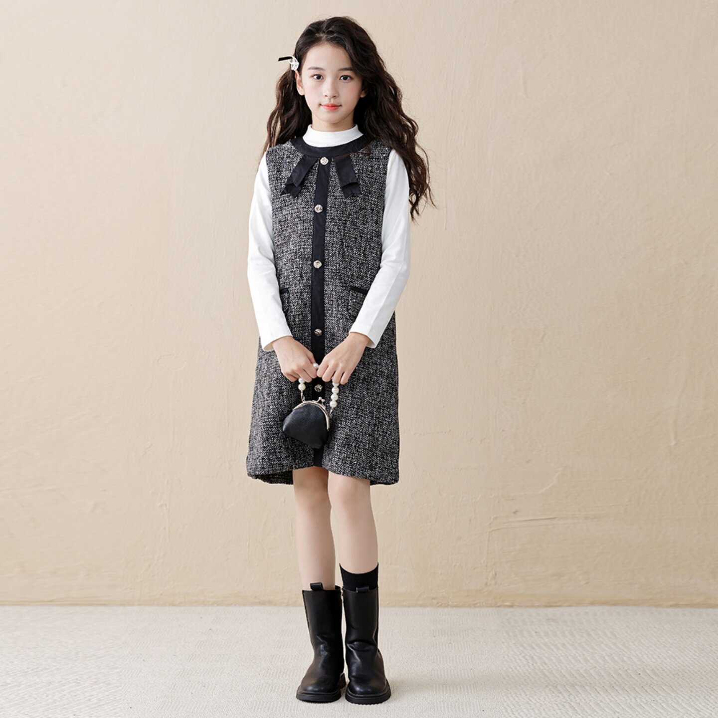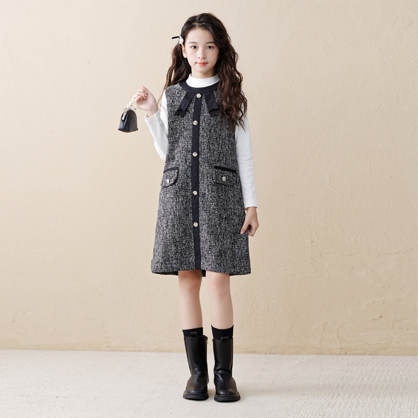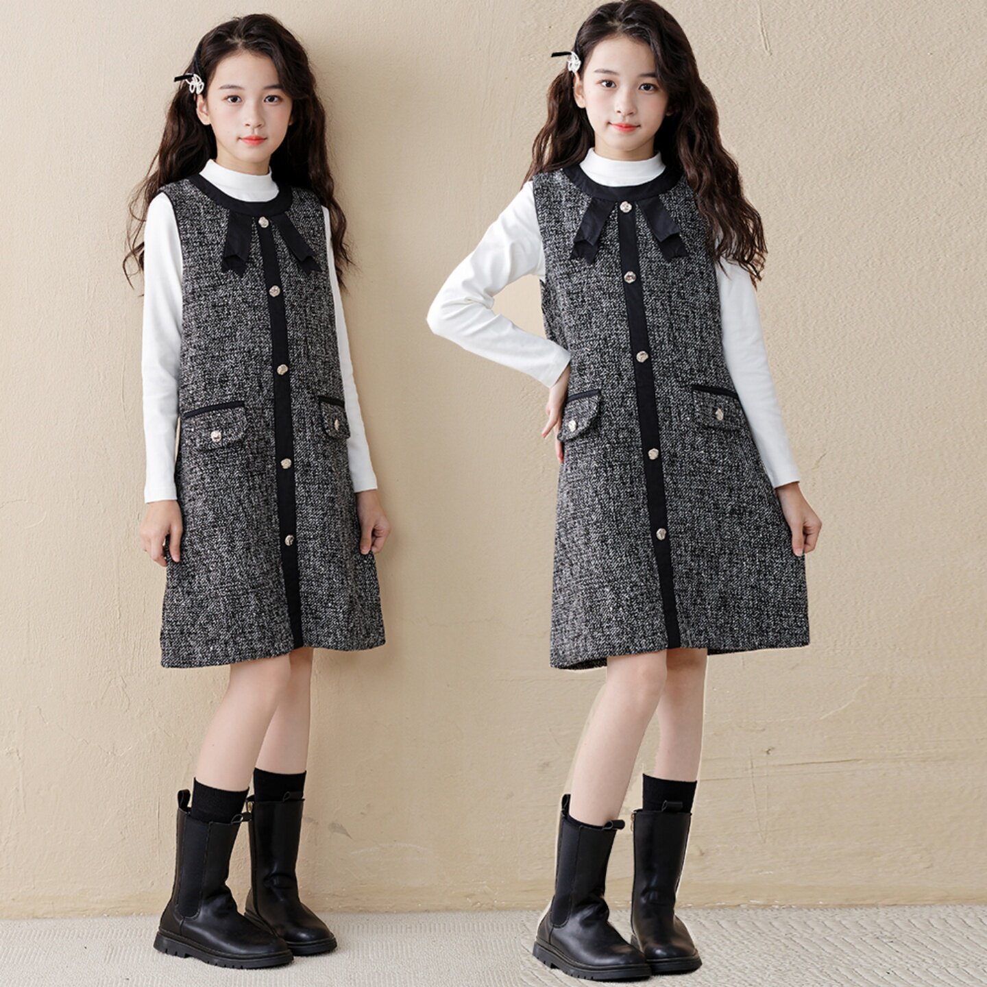 中大童加绒马甲连衣裙两件套装 洋气亲子装 女童小香风背心裙秋冬款