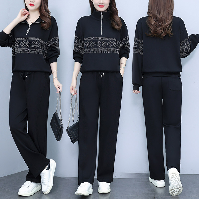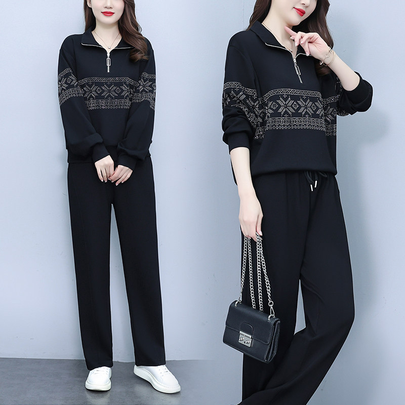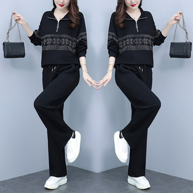 春秋季 套装 女装 两件套 时尚 宽松显瘦胖妹妹上衣直筒裤 新款 洋气大码