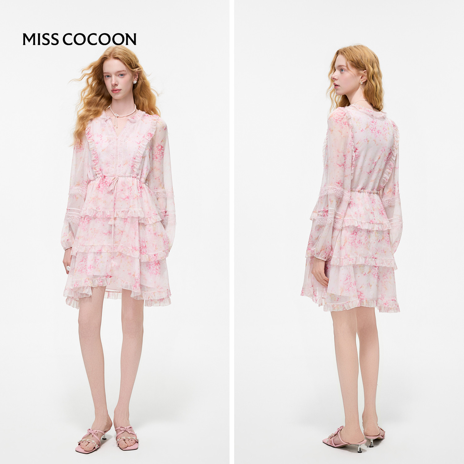 MISSCOCOON可可尼V领长袖 田园风白色苎麻连衣裙 碎花裙女26春新款由