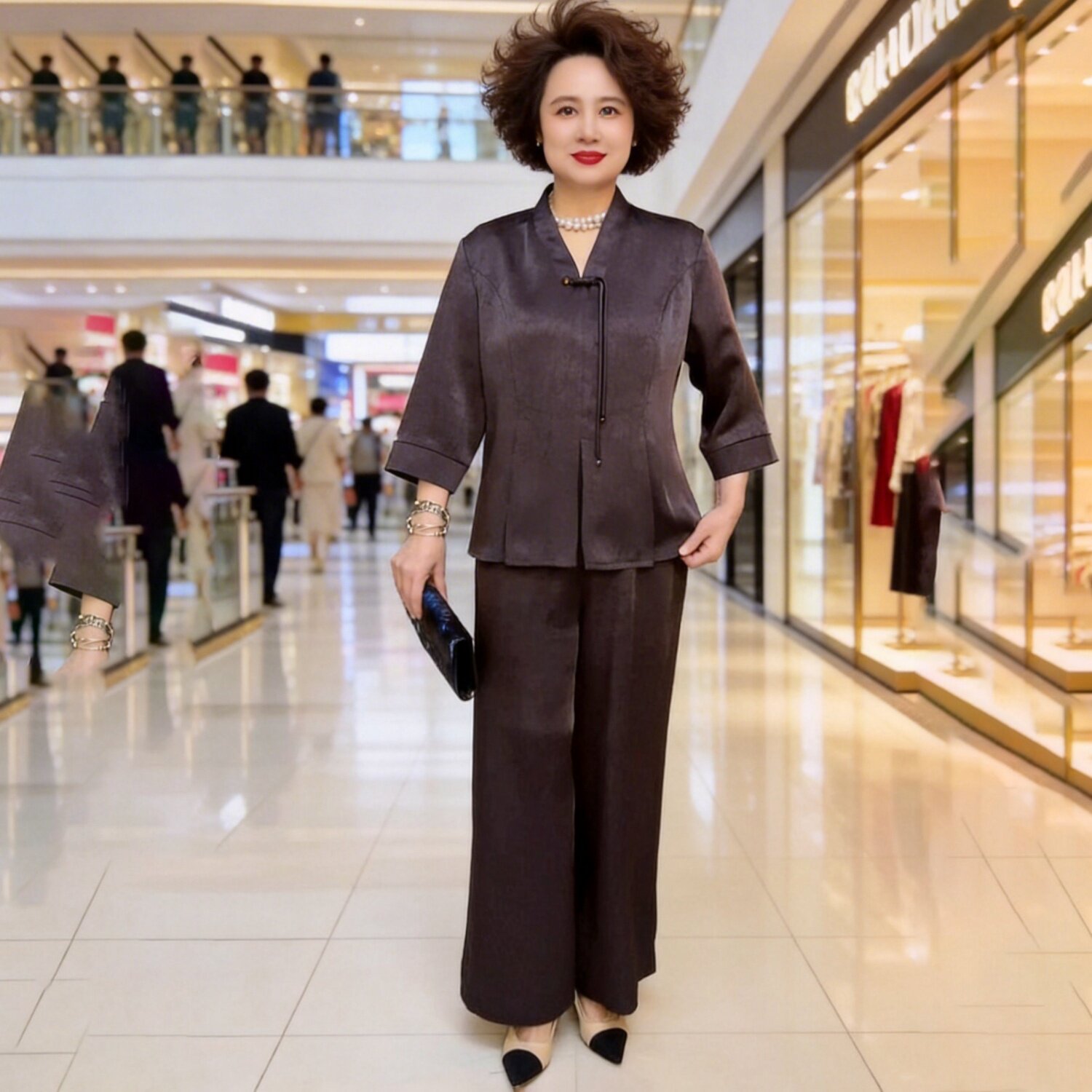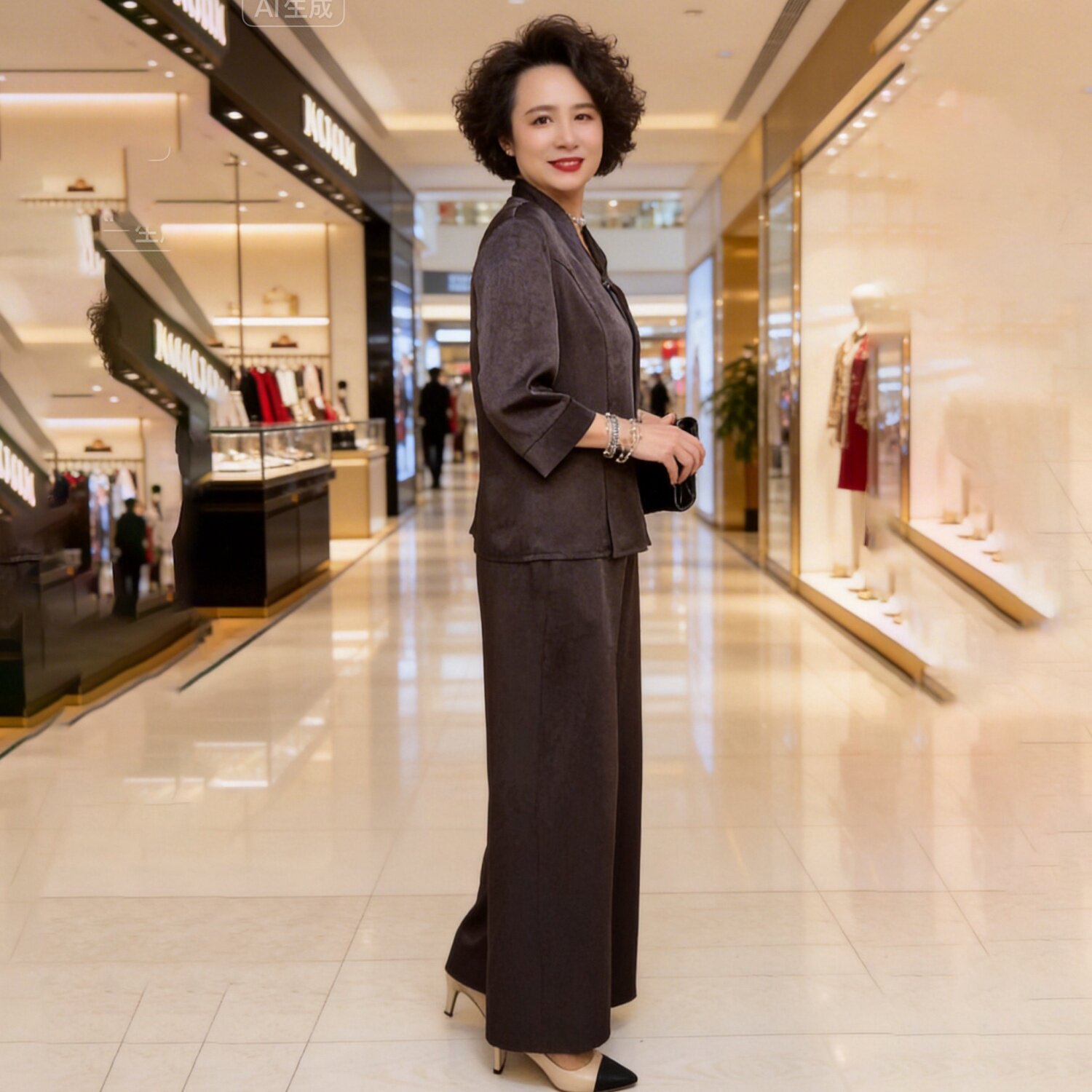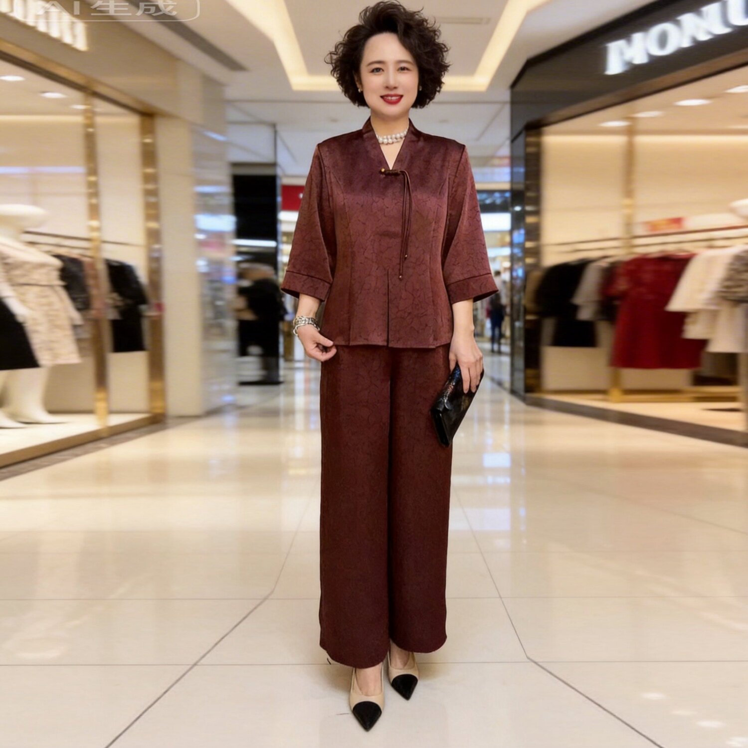 气质套装 女 上衣阔腿裤 洋气妈妈醋酸提花缎两件套春夏国风旗袍小衫