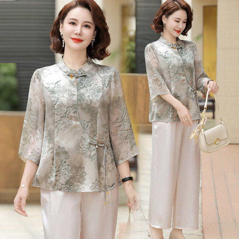 夏装 新中式 真丝女高端两件套中老年女士洋气桑蚕丝套装 国风 妈妈款