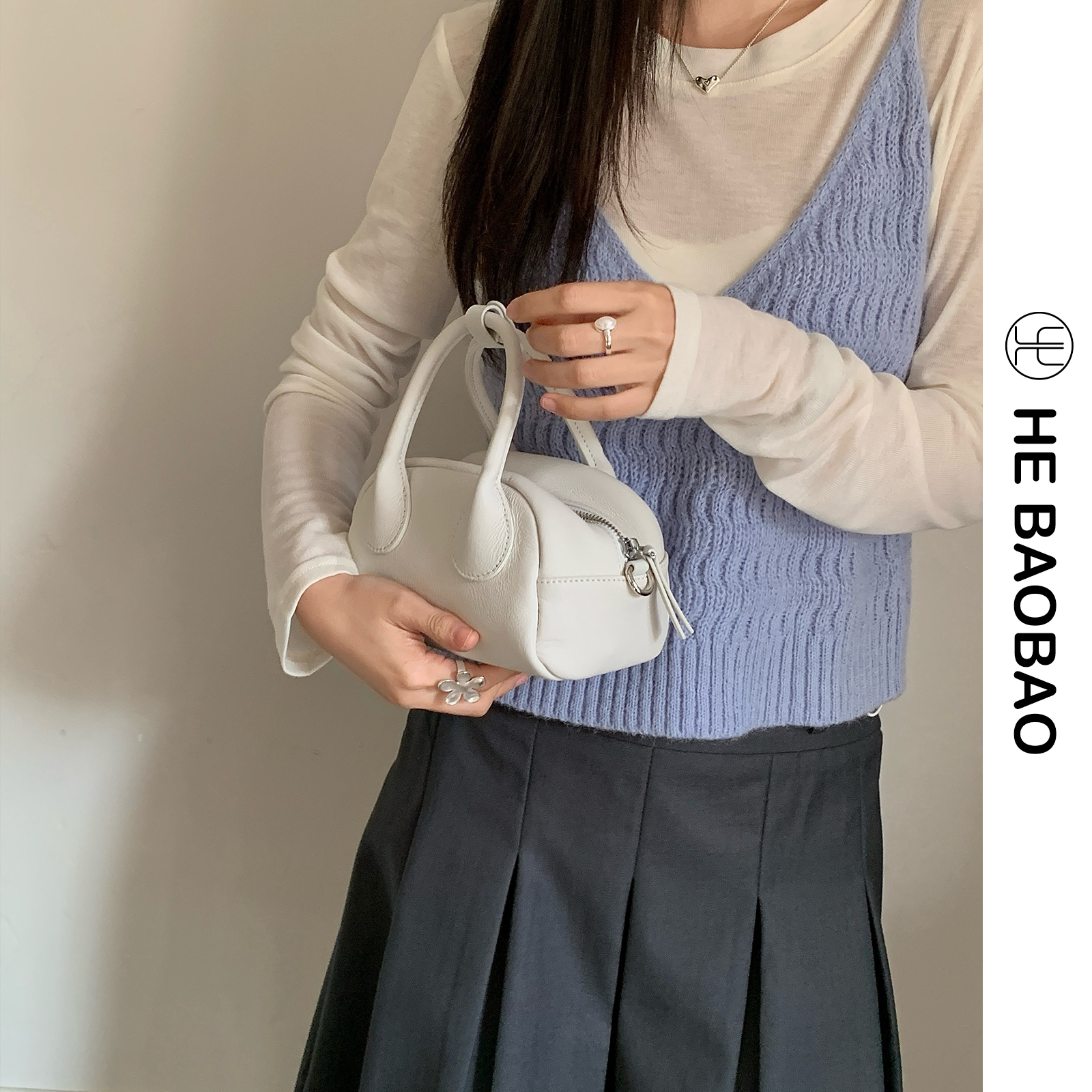 HEBAOBAO新品 春夏保龄斜挎包球手拎手机女包 真皮小包2026新款