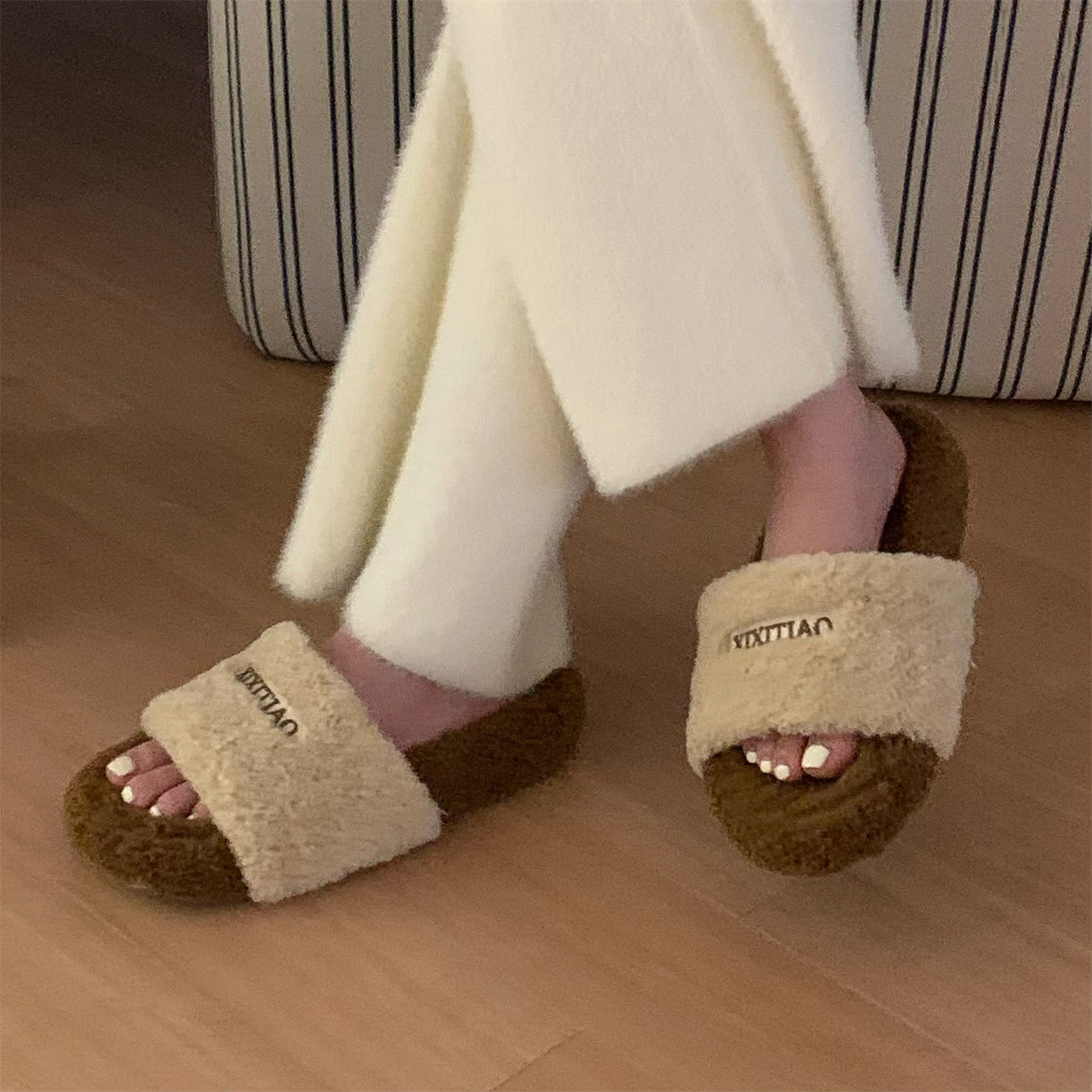 细细条 女秋冬复古时尚 外穿一字棉拖鞋 休闲防滑网红居家毛毛拖鞋