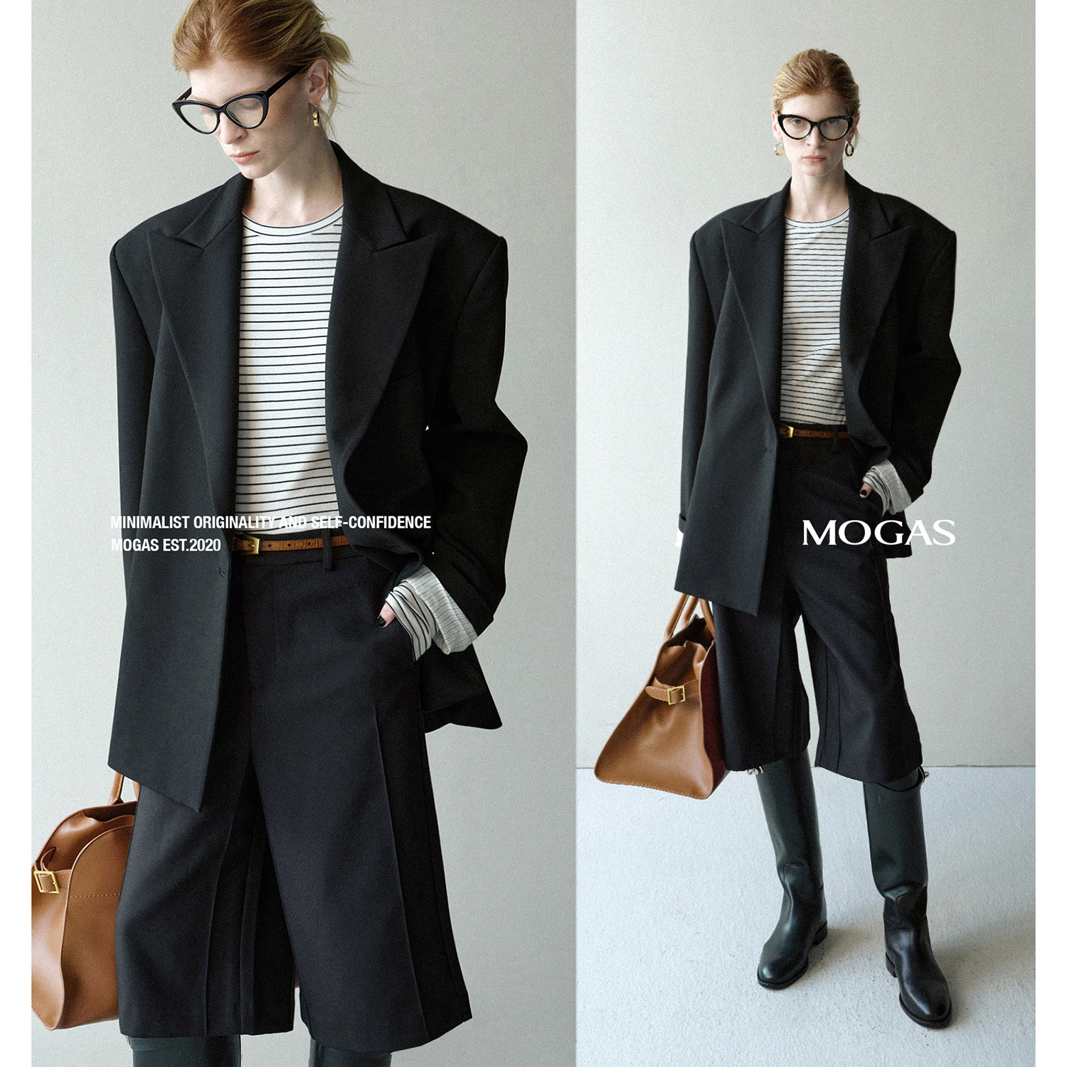 Mogas沙漏西装 裤 套装 女秋 羊毛混纺宽垫肩收腰金属扣外套七分西装由