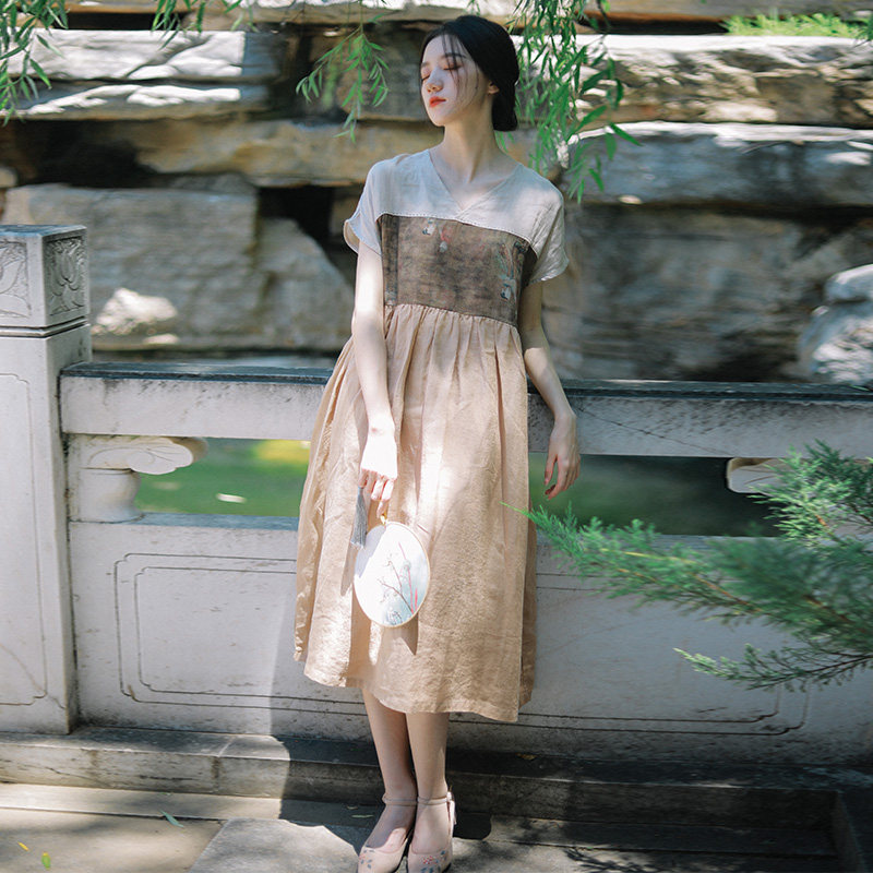 系列原创设计文艺印花开叉连衣长裙新中式 旗袍夏 秋序 小鹿弥雅