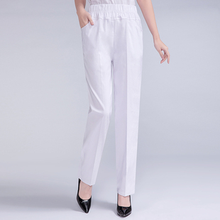 薄款 夏季 弹力直筒白色长裤 高腰松紧宽松大码 妈妈休闲裤 中老年女裤