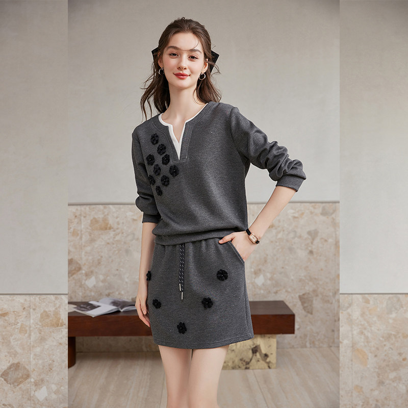 白鹿语轻熟风V领假两件卫衣半裙两件套26春新款 慵懒洋气减龄套装