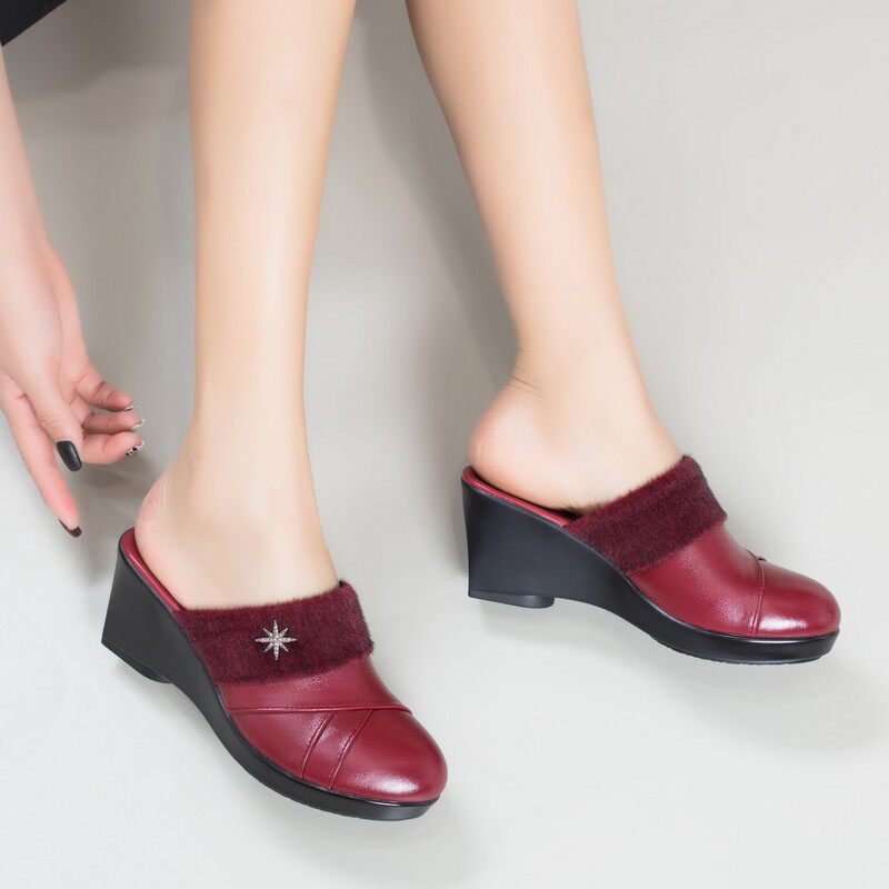 包头皮拖鞋 冬季 真皮女鞋 室内外加绒保暖棉拖鞋 粗跟中老年妈妈棉鞋由