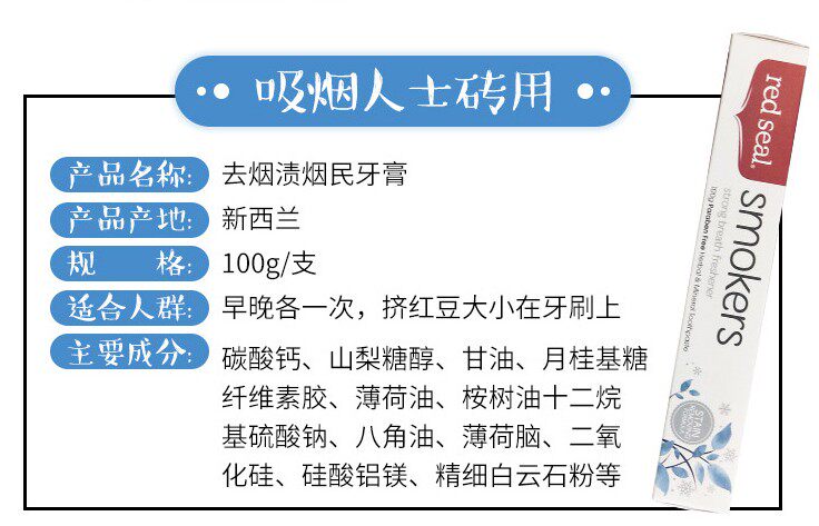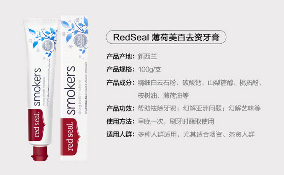 为您提供商品新西兰red 红印烟民牙膏强效去烟渍牙结石口臭无氟100g seal的详细介绍,