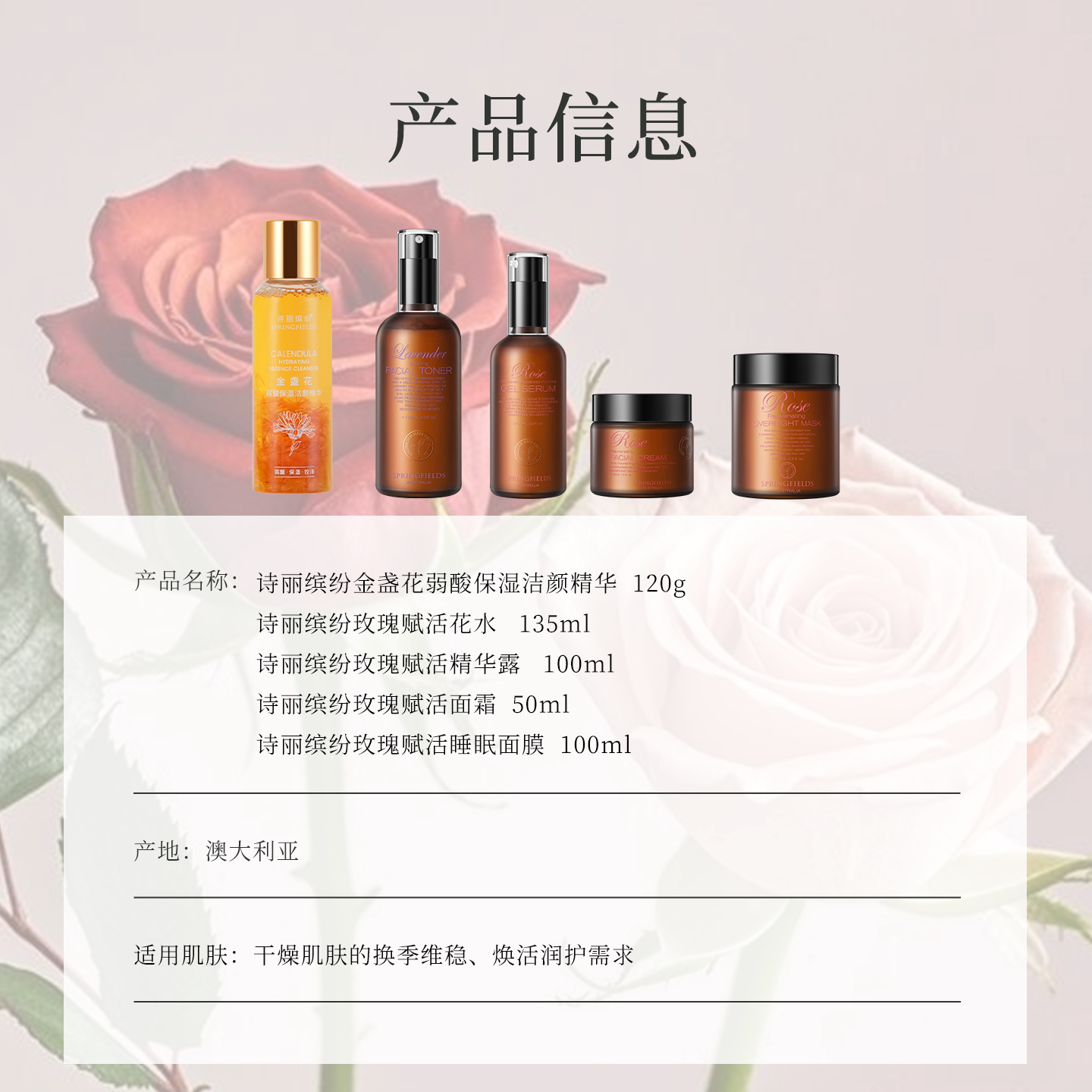 诗丽缤纷Springfields玫瑰面膜面霜精华薰衣草花水爽肤水洗面奶fh由