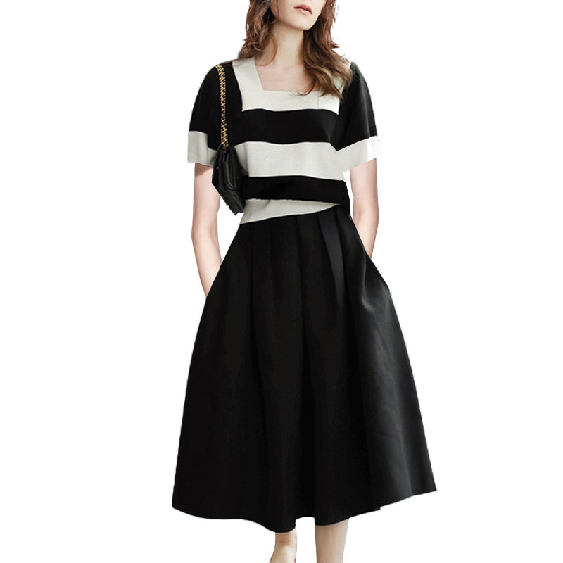 洋气减龄条纹针织衫 2026年春季 新款 时尚 女 黑色半身裙盐系两件套装由