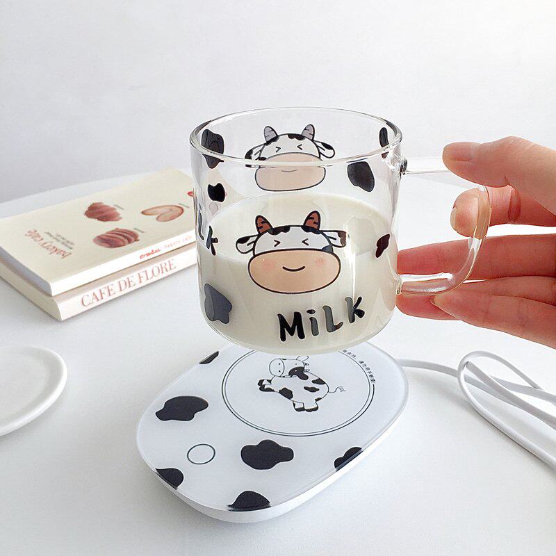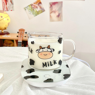 SHˇ恒温55度加热暖暖杯韩国ins风玻璃杯子带勺盖学生宿舍热牛奶