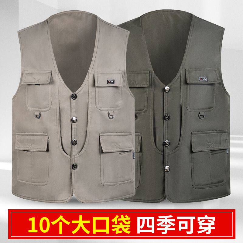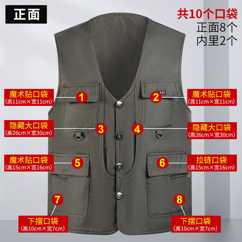 中老年春秋男式 坎肩V领多口袋户外钓鱼摄影马夹男 马甲双层按扣款由