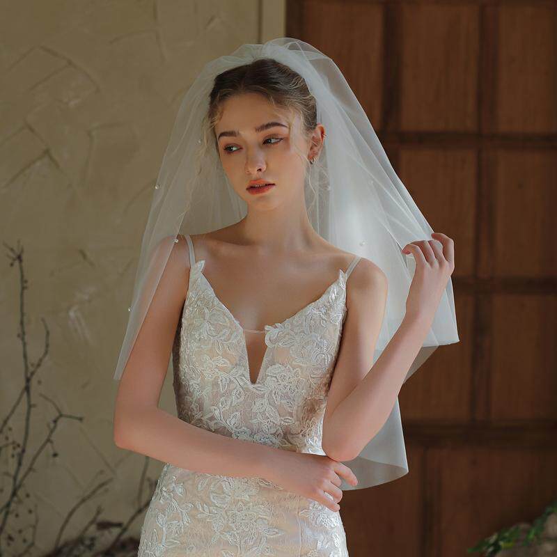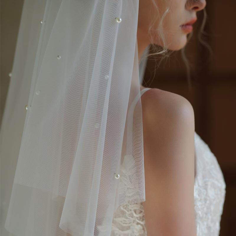 V383白色双层珍珠头纱简约领证登记结婚新娘高级感求婚礼拍照道具