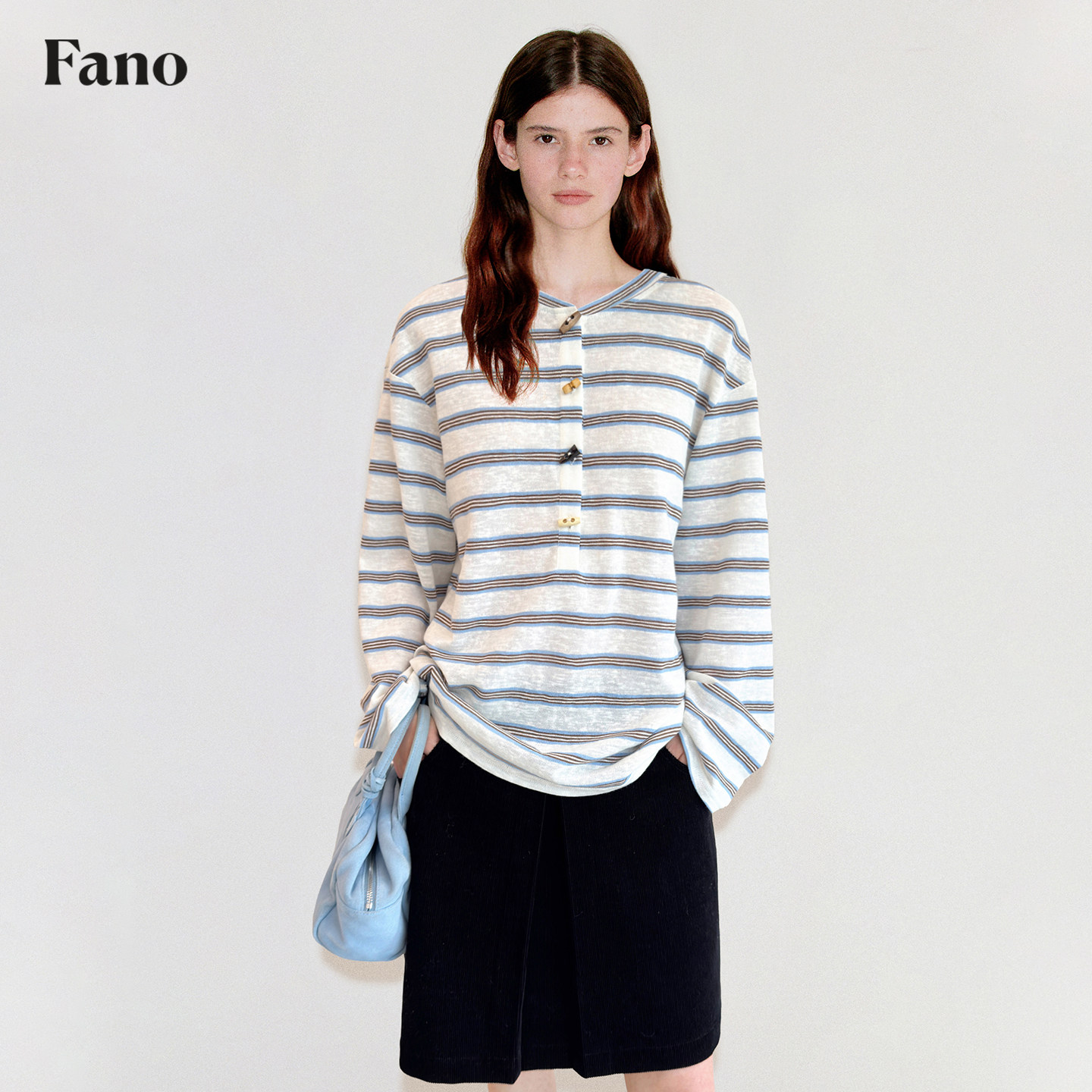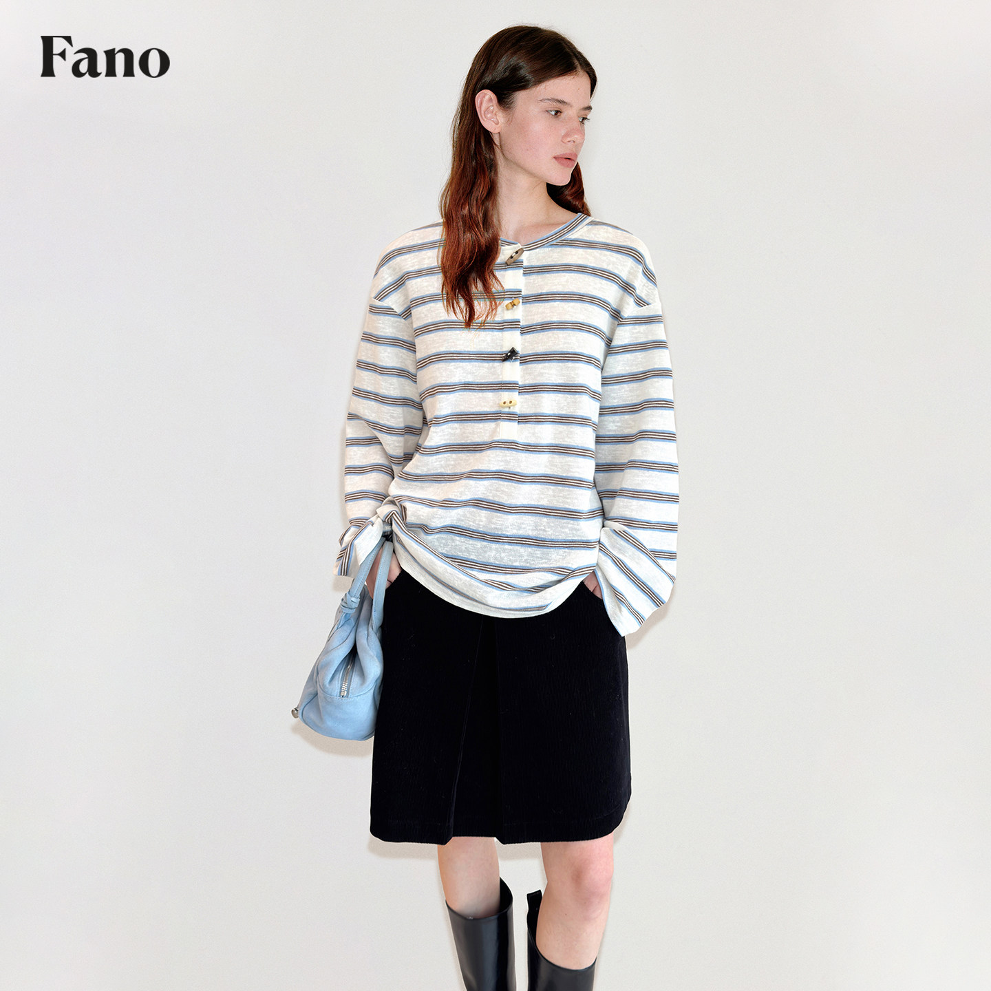 为您提供商品范洛Fano 复古慵懒条纹长袖 宽松T恤女2026新款 miu系牛角扣亨利衫的详细介绍,