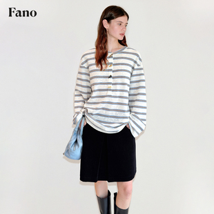 范洛Fano 复古慵懒条纹长袖 宽松T恤女2026新款 miu系牛角扣亨利衫由