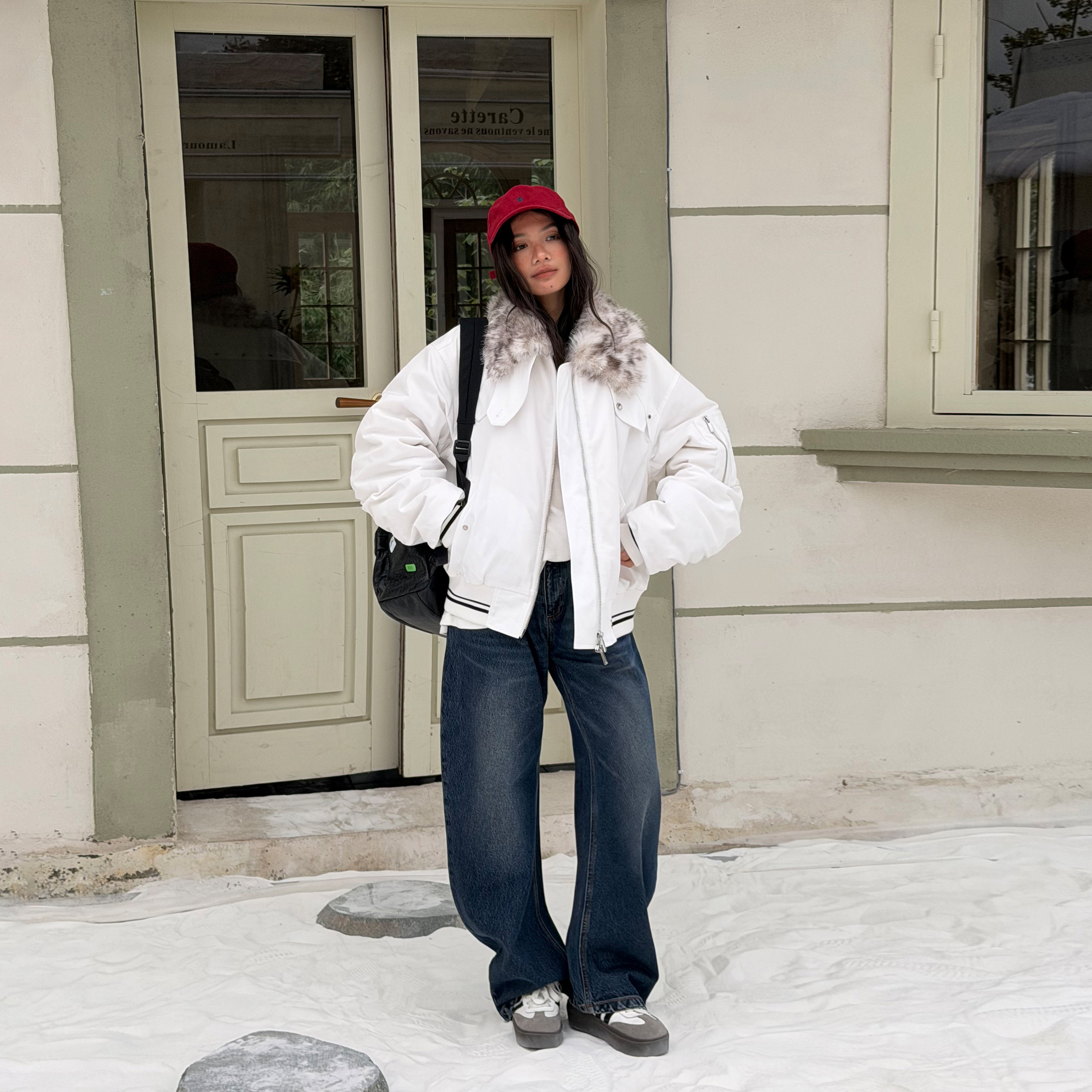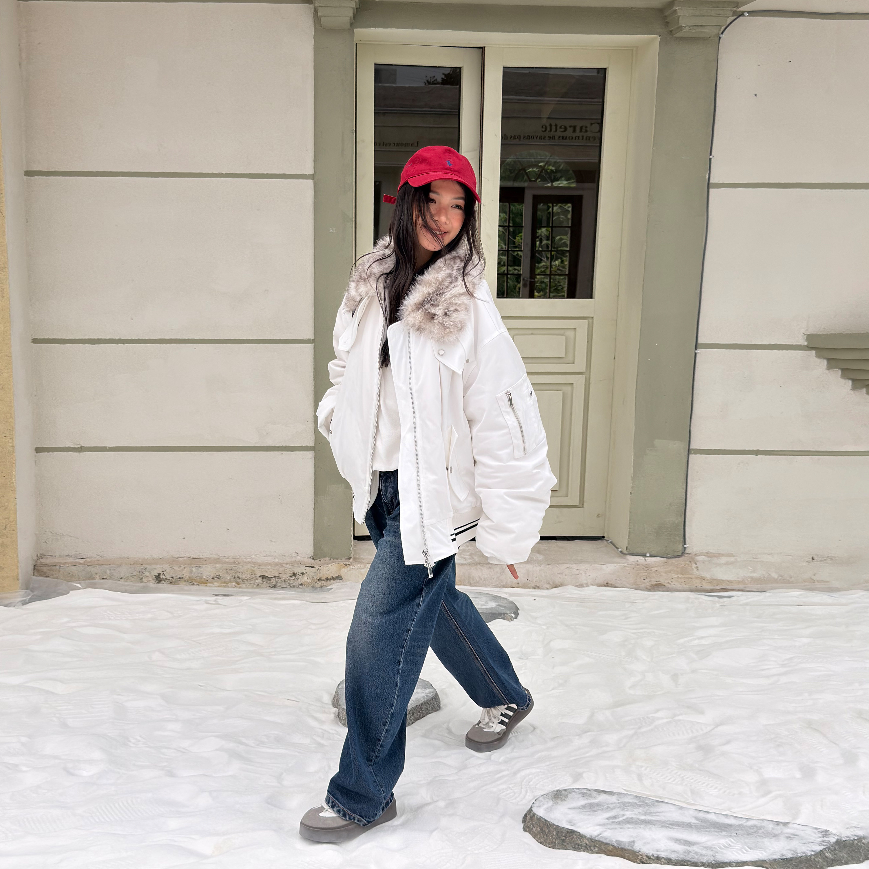 LEDIM 毛绒内胆女白色上衣 WANG动物纹毛领皮草棒球外套25秋冬新款