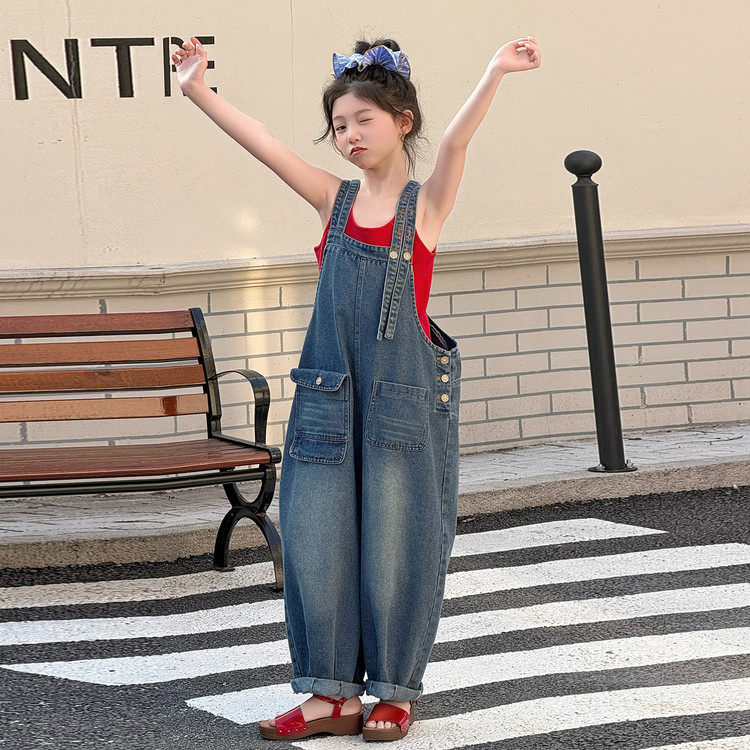 夏季 韩版 女童牛仔背带裤 套装 休闲 两件套洋气阔腿裤
