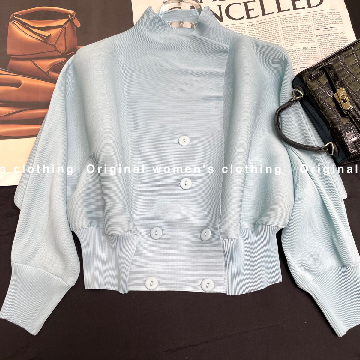 小衫 贝贝 松驰感双排扣蝙蝠七分袖 褶皱翻领开衫 云X421 不含项链
