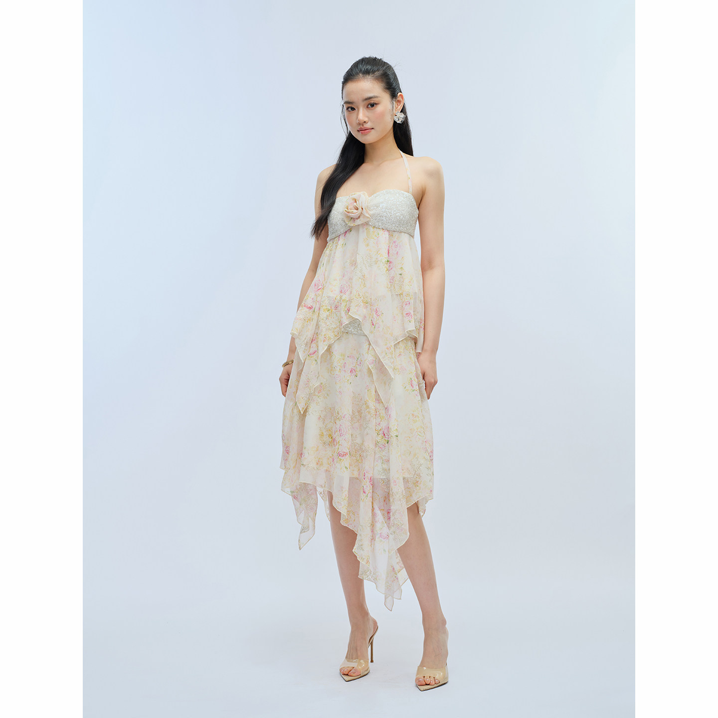 柔瓣印日 亮片印花雪纺绑带立体花朵背心半裙套装 TheChosen