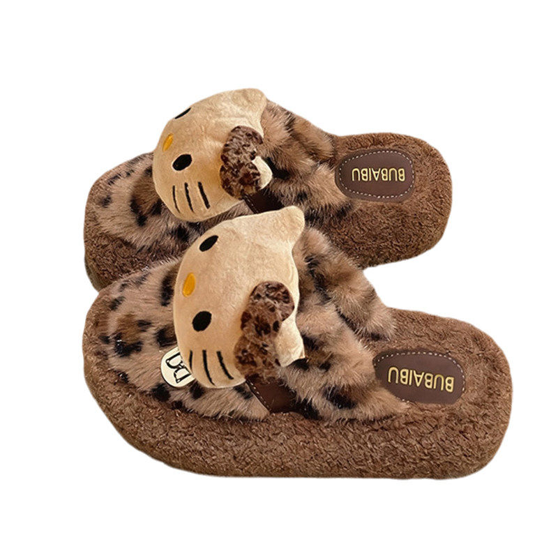 女秋冬厚实加绒保暖包头豹纹毛绒拖鞋 毛毛豹纹棉拖鞋 豹纹KT猫