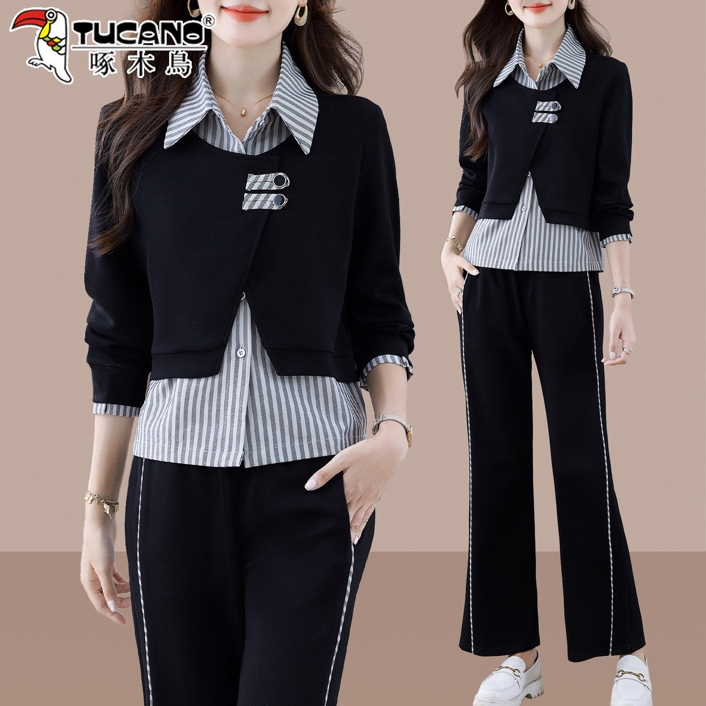 啄木鸟卫衣运动套装 春秋洋气减龄灰色假两件翻领两件套 女2026新款由