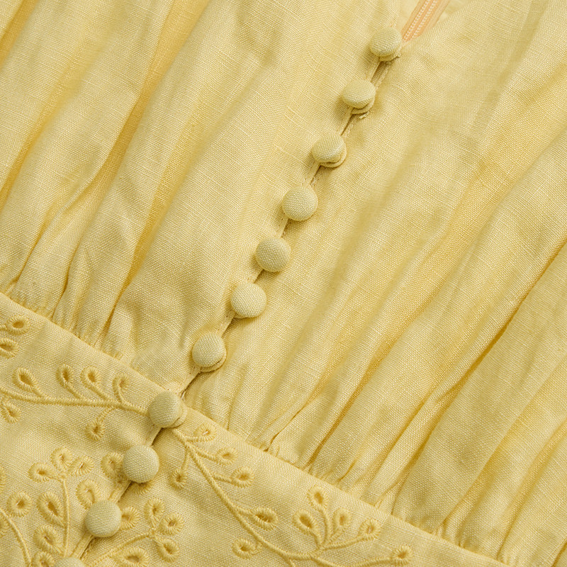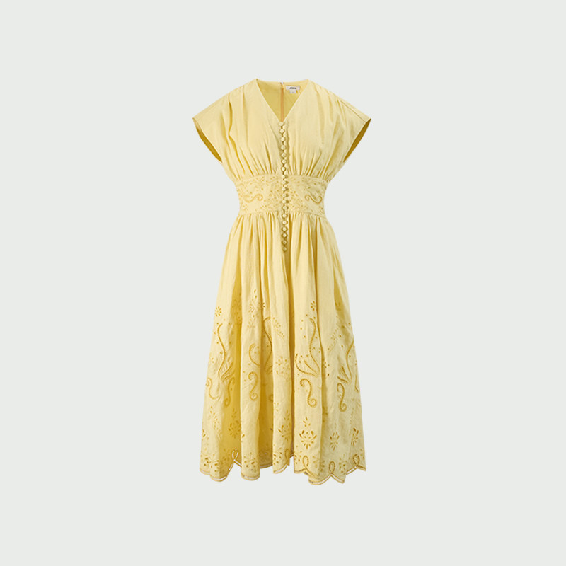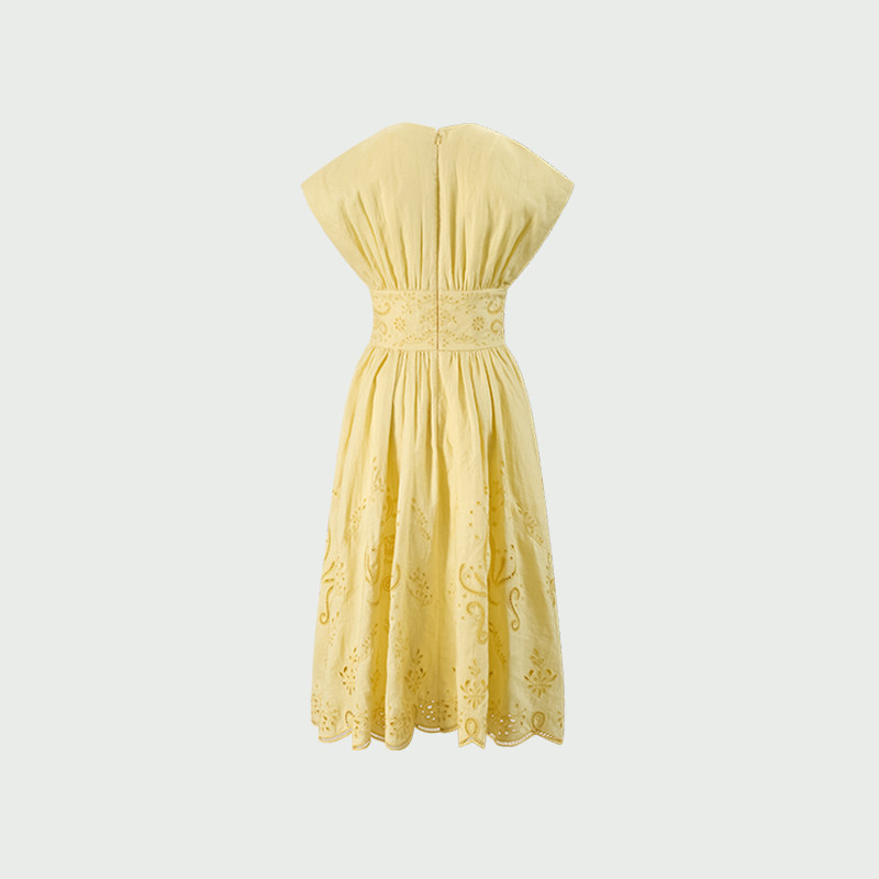 JASON 新款 镂空刺绣收腰连衣裙女士V领亚麻短袖 轻奢风裙子 WU夏季由