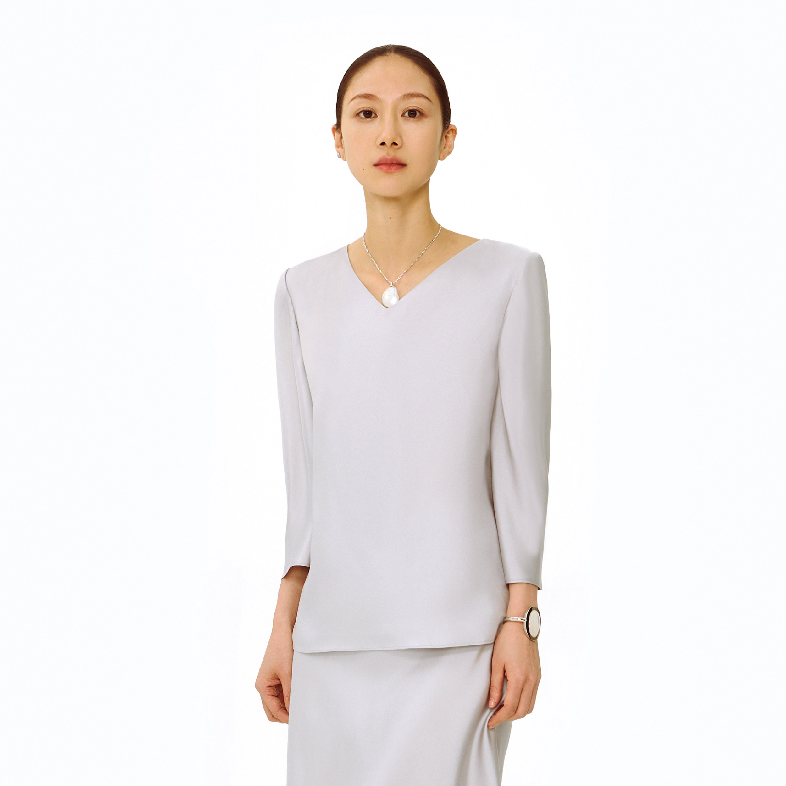 真丝上衣女V领简约气质中长袖 T恤 新款 林乔芝2026年春夏季由