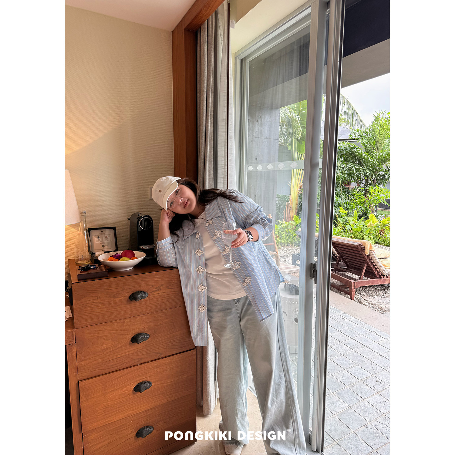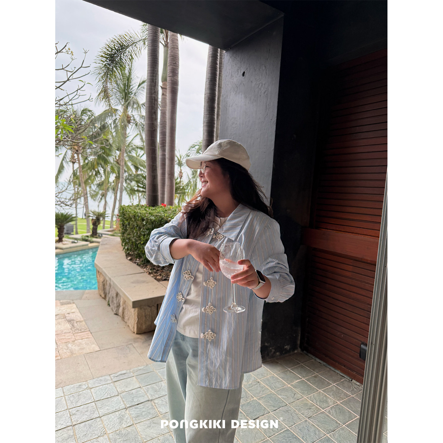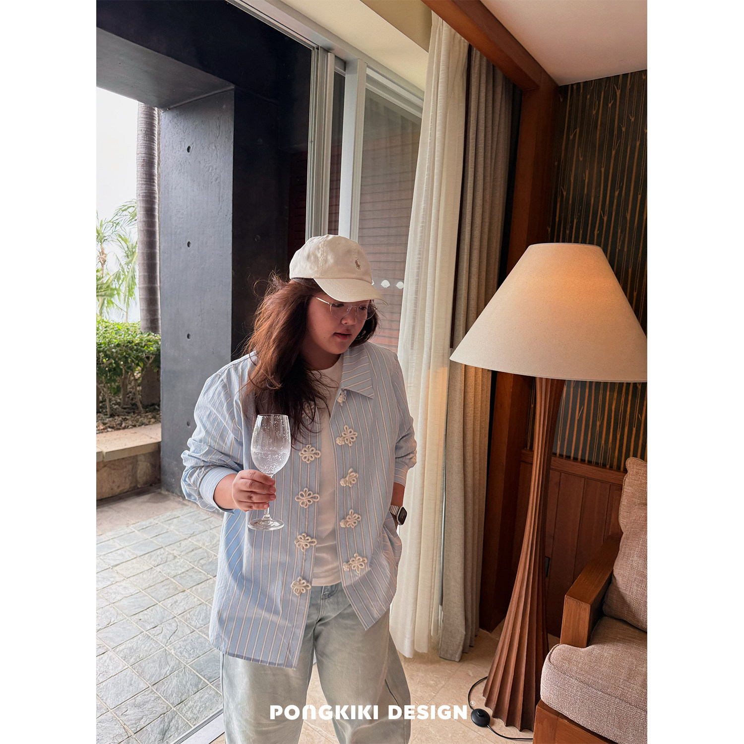 衬衫 老章和小胖PONGKIKI大码 胖mm蓝色长袖 盘扣条纹衬衫 女装 新中式