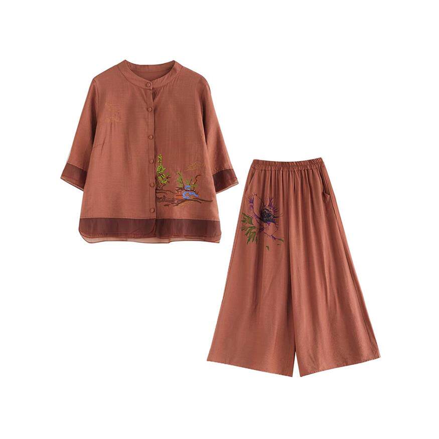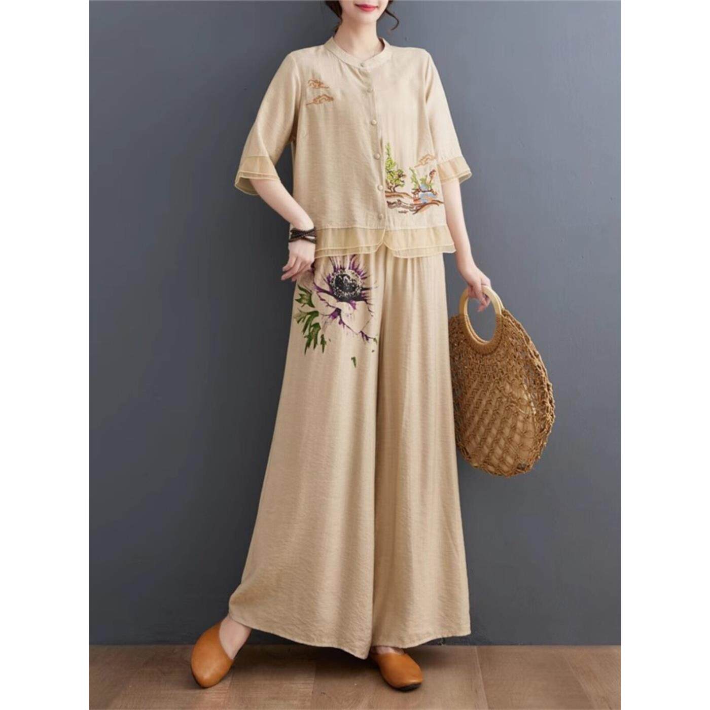 洋气宽松亚麻阔腿裤 高端棉麻套装 两件套 时尚 大码 女士2025夏装 新款