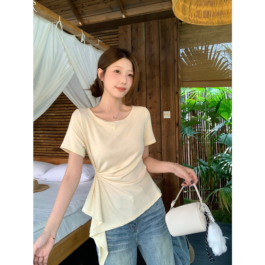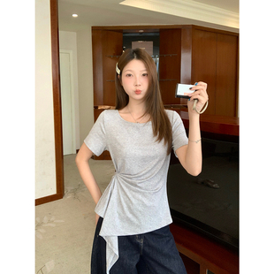 2026夏季 T恤女大码 胖MM港式 小众别致收腰减龄上衣 荷叶边抽绳短袖由