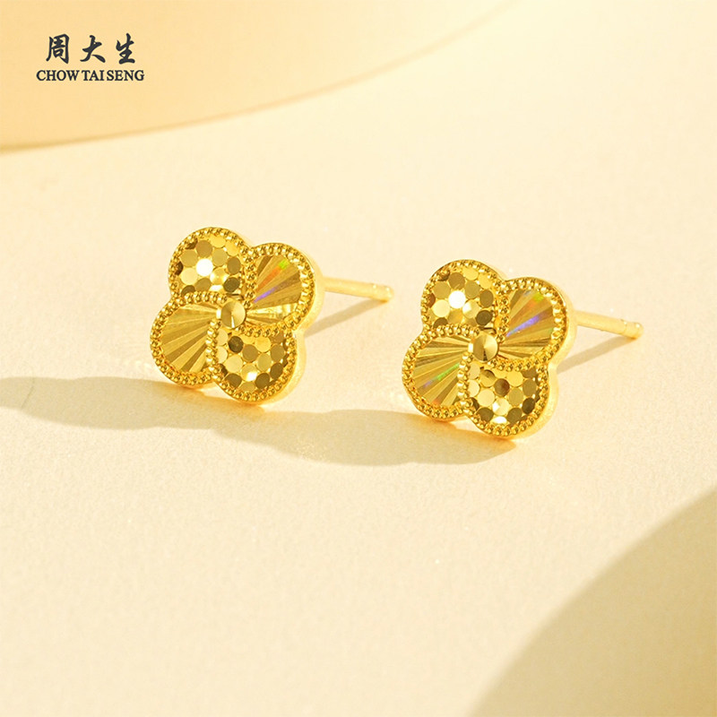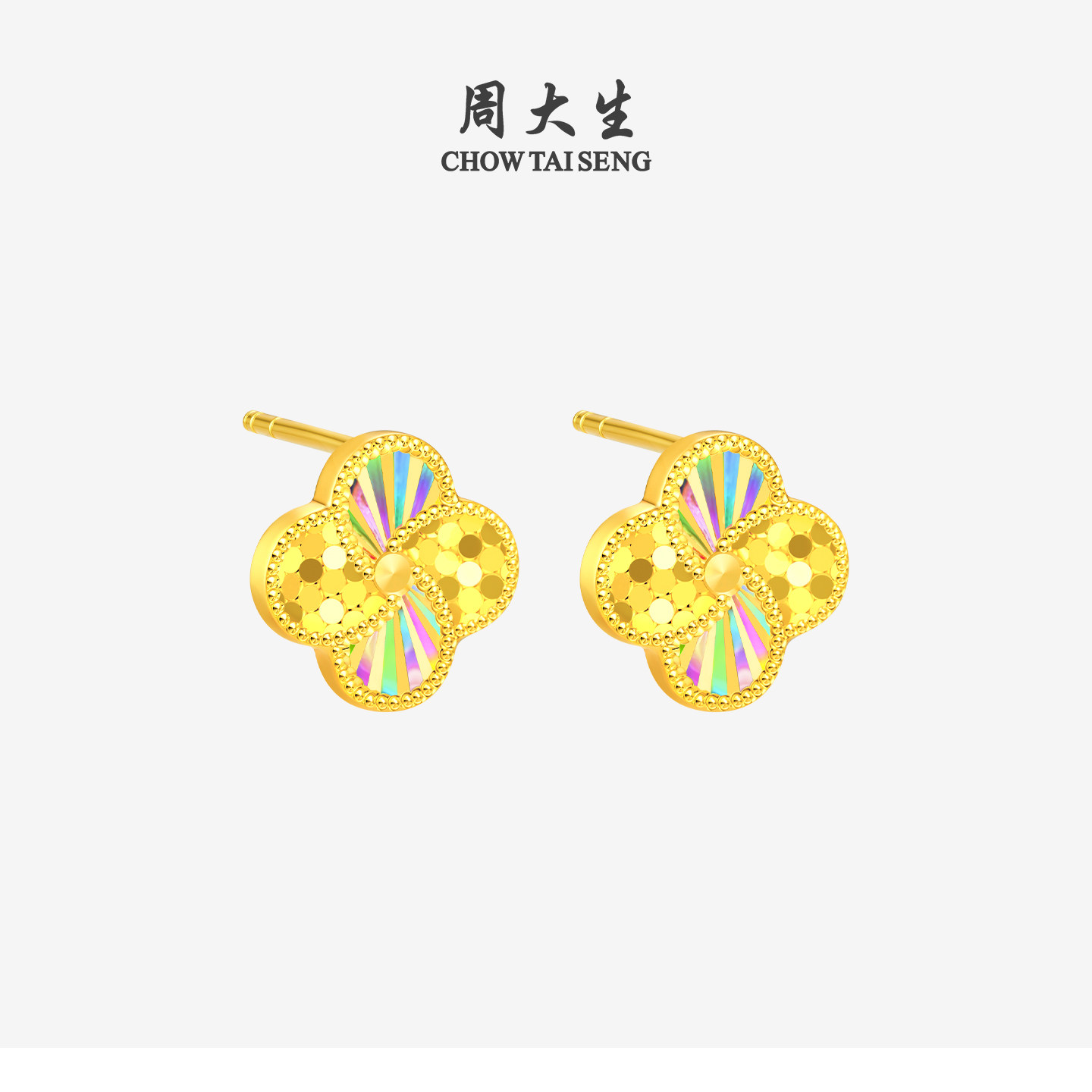 周大生黄金耳钉女足金幸运四叶草耳饰炫彩蜂巢耳环生日礼物送女友
