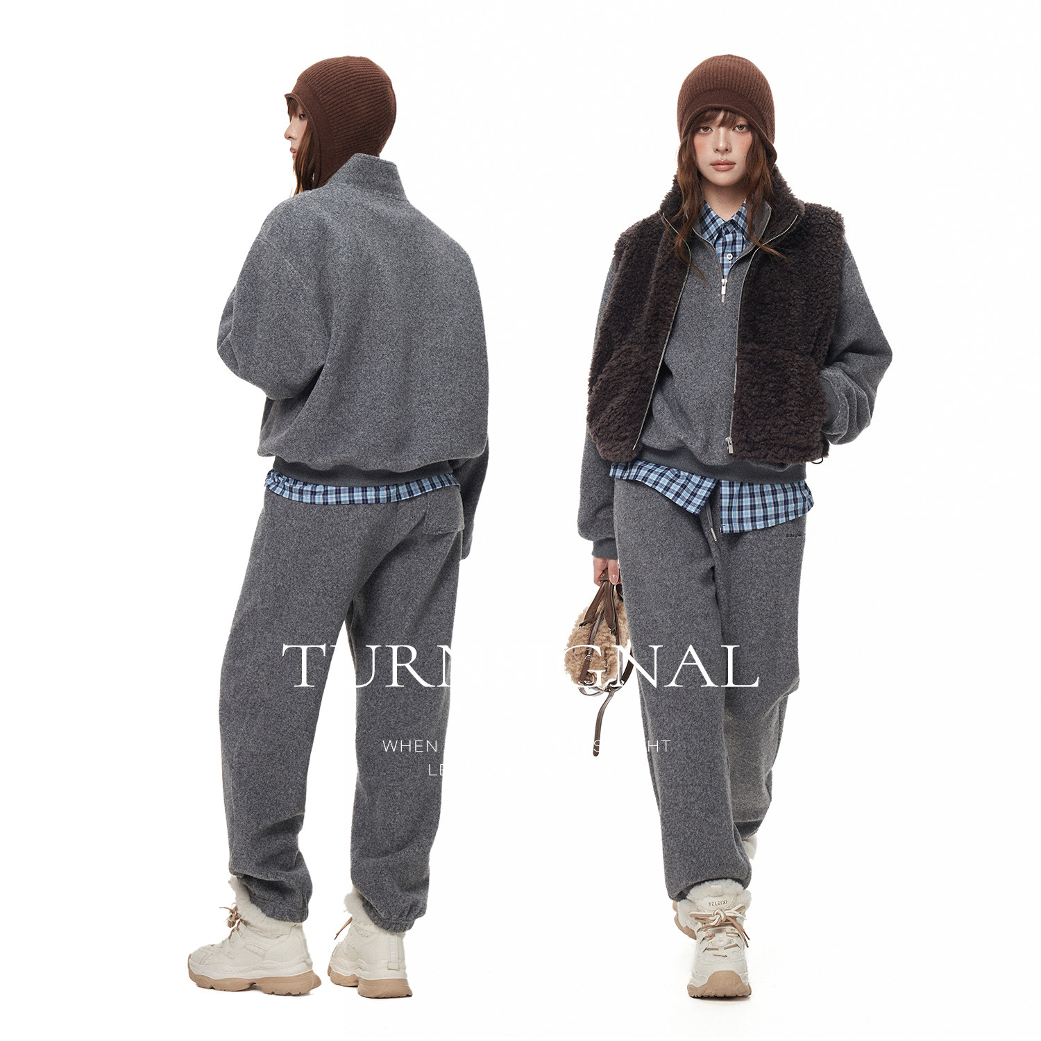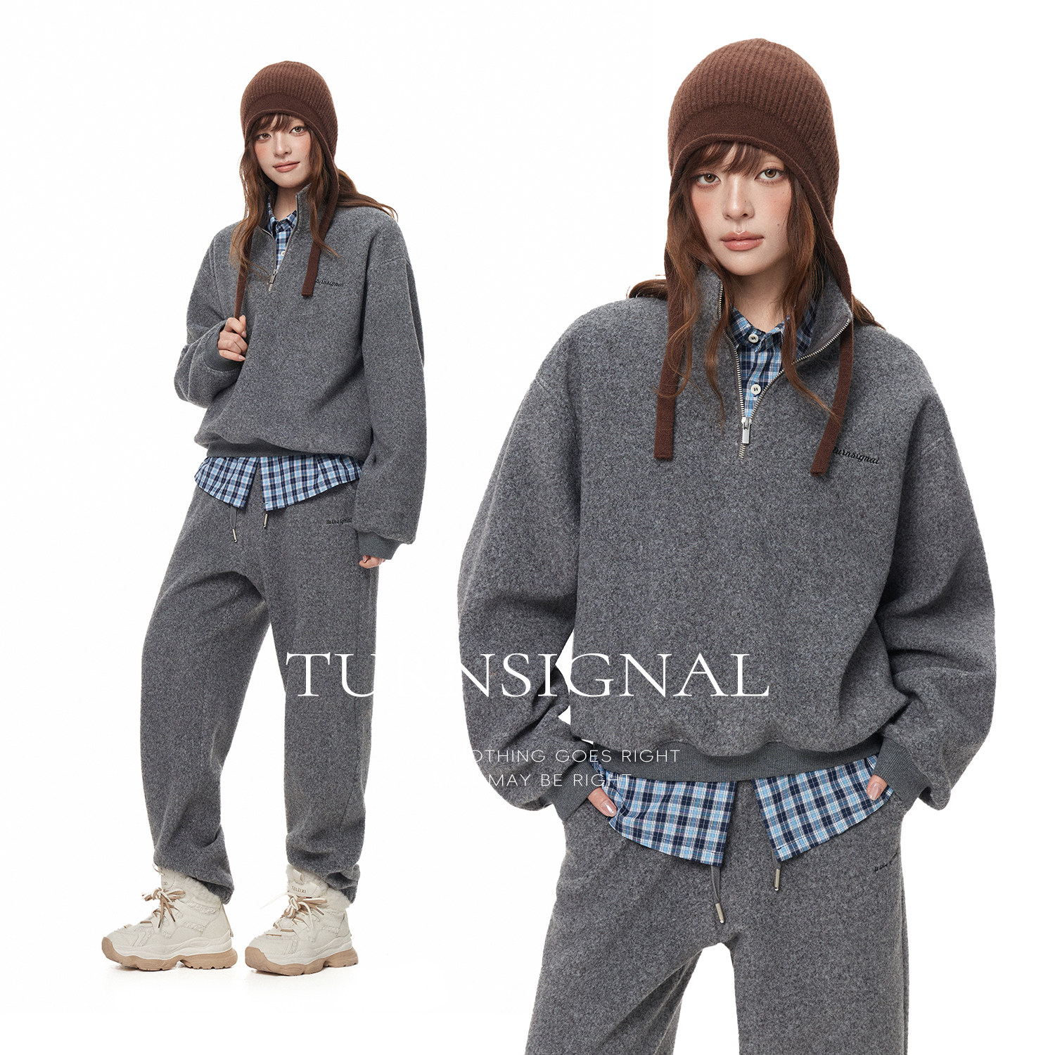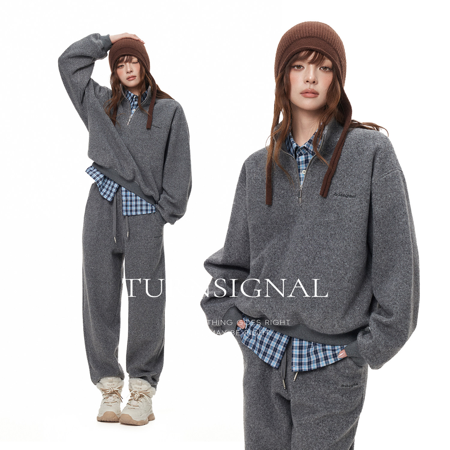 TurnSigna半拉链毛呢卫衣卫裤 女秋冬加厚休闲宽松运动两件套 套装由