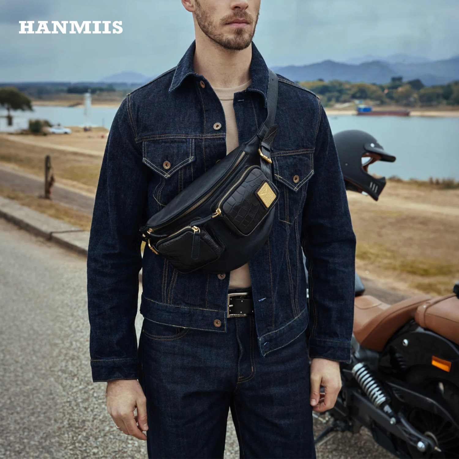 HANMIIS鳄鱼纹胸包 单肩斜挎包骑行男包休闲 头层牛皮复古真皮男士