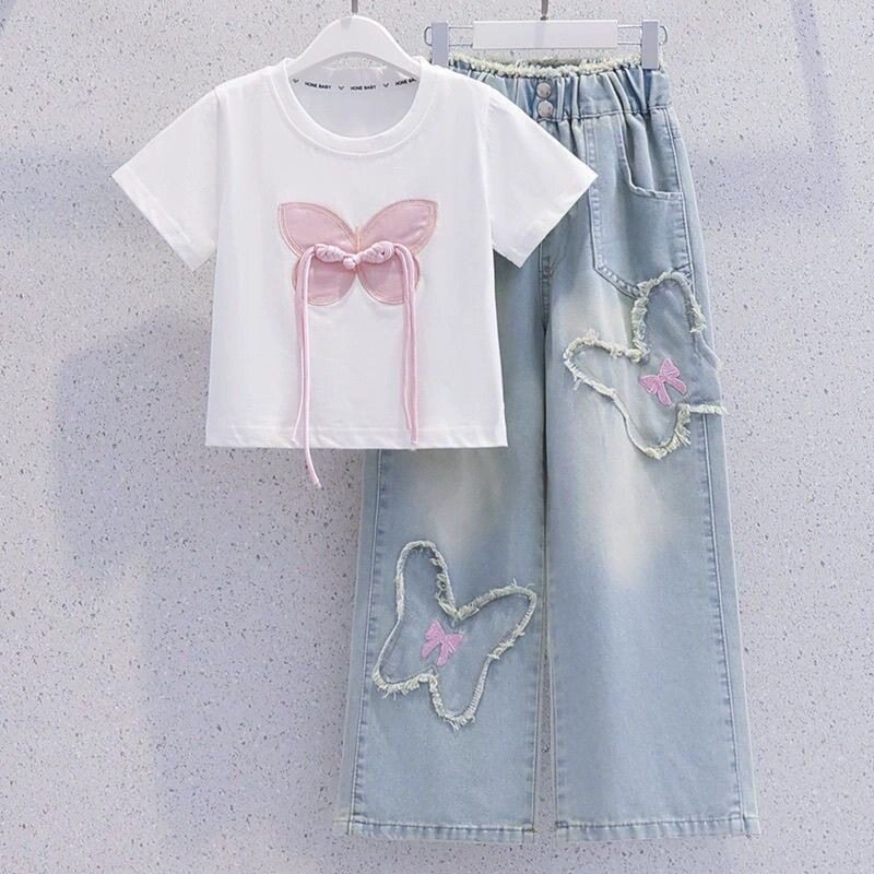 新款 女童夏季 国风短袖 套装 两件套 中大儿童洋气T恤女孩牛仔阔腿裤由