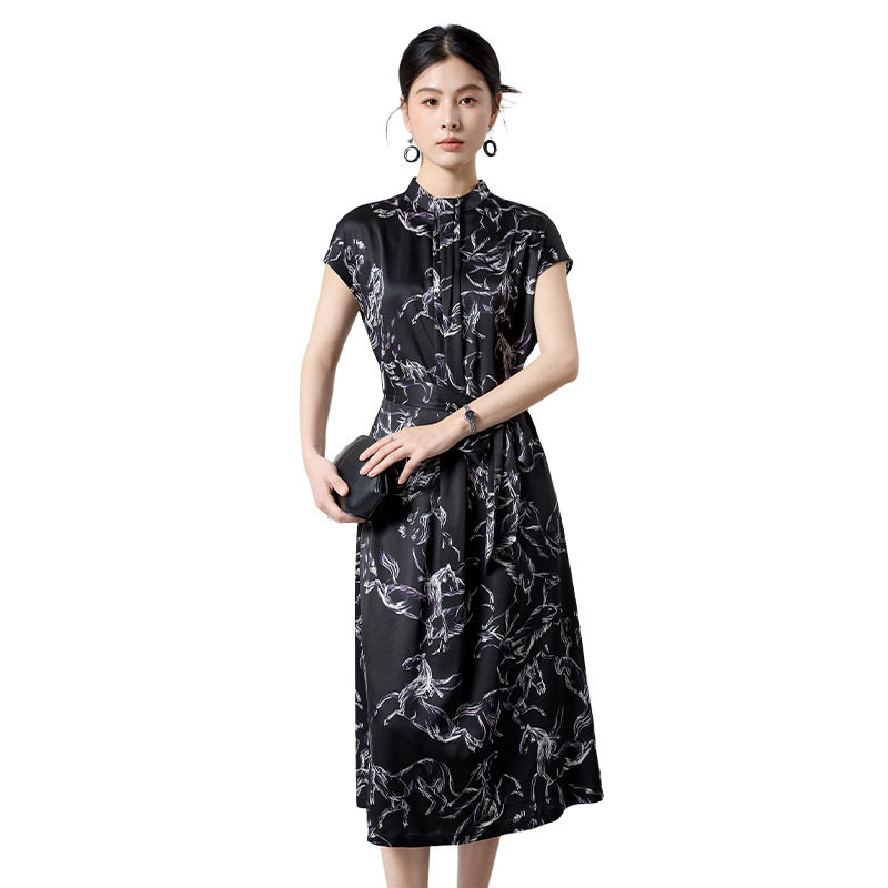 杭州丝艺2026春夏小众特色连衣裙飞马印花裙子重磅姆米弹力气质裙由