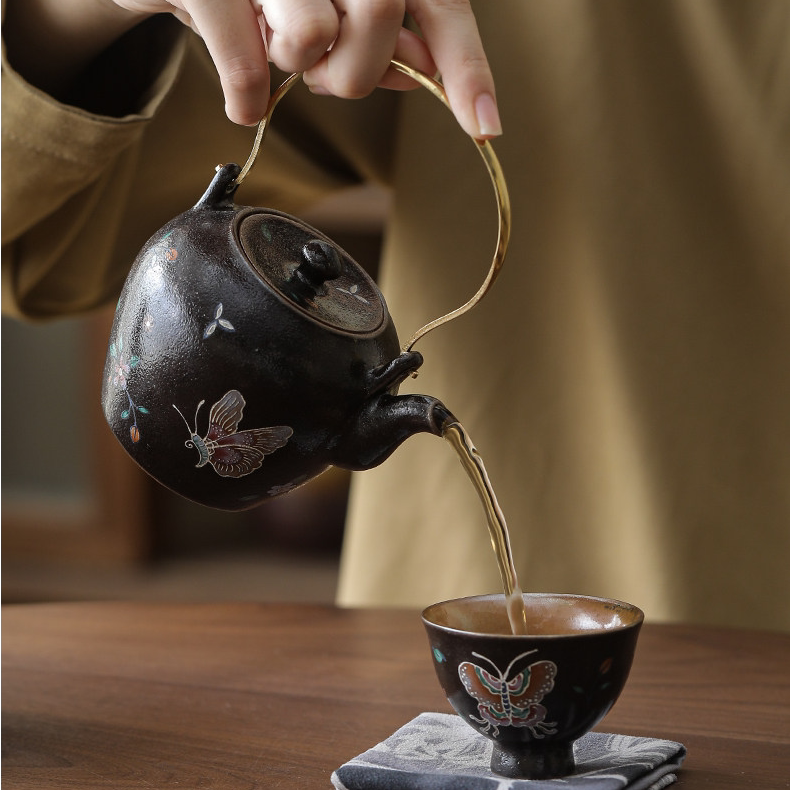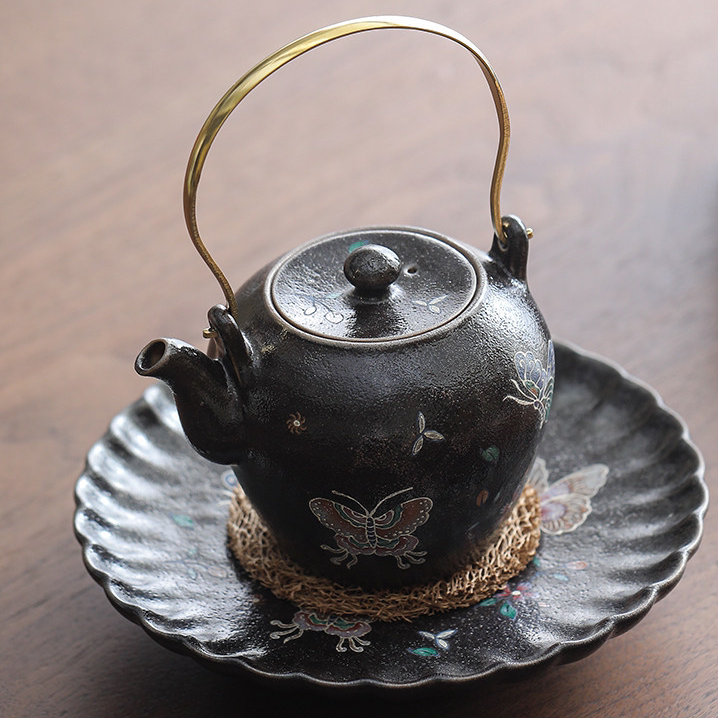 亘古 陶瓷泡茶壶 暗夜蝶舞黑志野烧粗陶提梁壶焖泡茶壶家用中式由