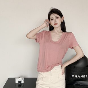 实拍夏季 高级感薄款 软糯凉爽好穿垂感面膜锁骨U领短袖 T恤 新款
