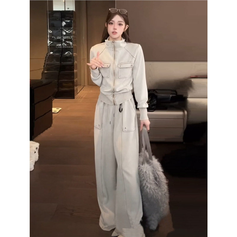 2026超火酷飒冰川灰套装 两件套 女春秋减龄洋气阔腿裤