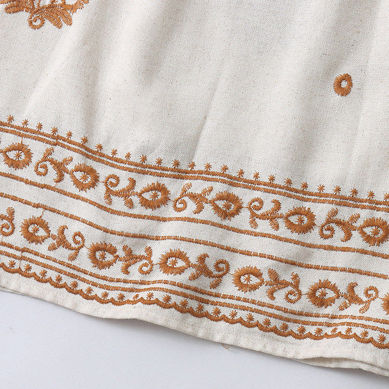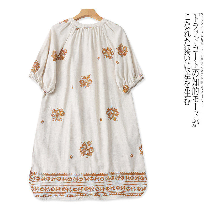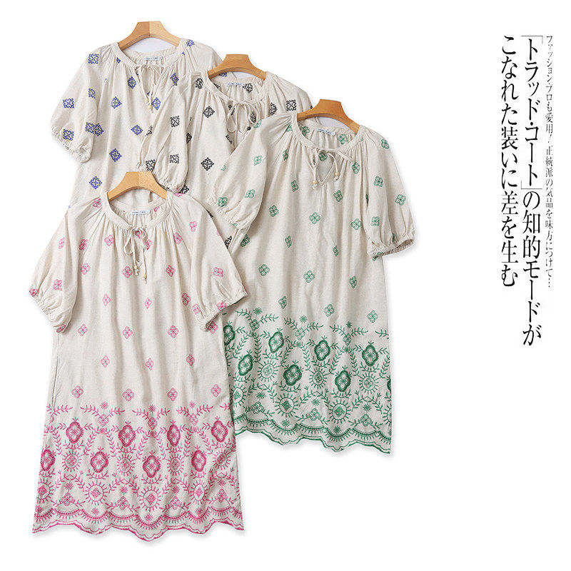 H4856外贸欧美单女士短袖 圆领系带绣花宽松中长裙 棉麻连衣裙新款由