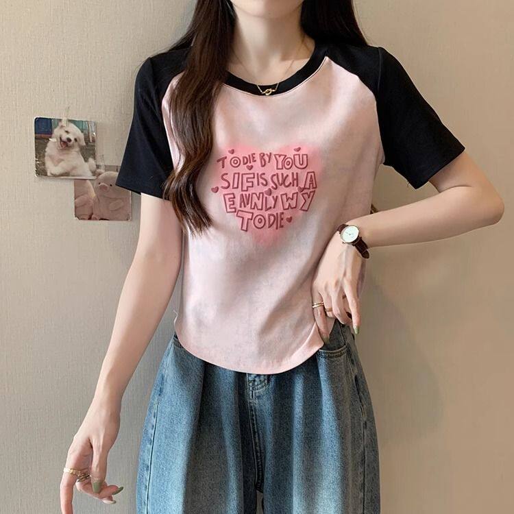 大码 扎染印花爱心短袖 t恤女夏季 显瘦弧形下摆撞色上衣 微胖mm时尚