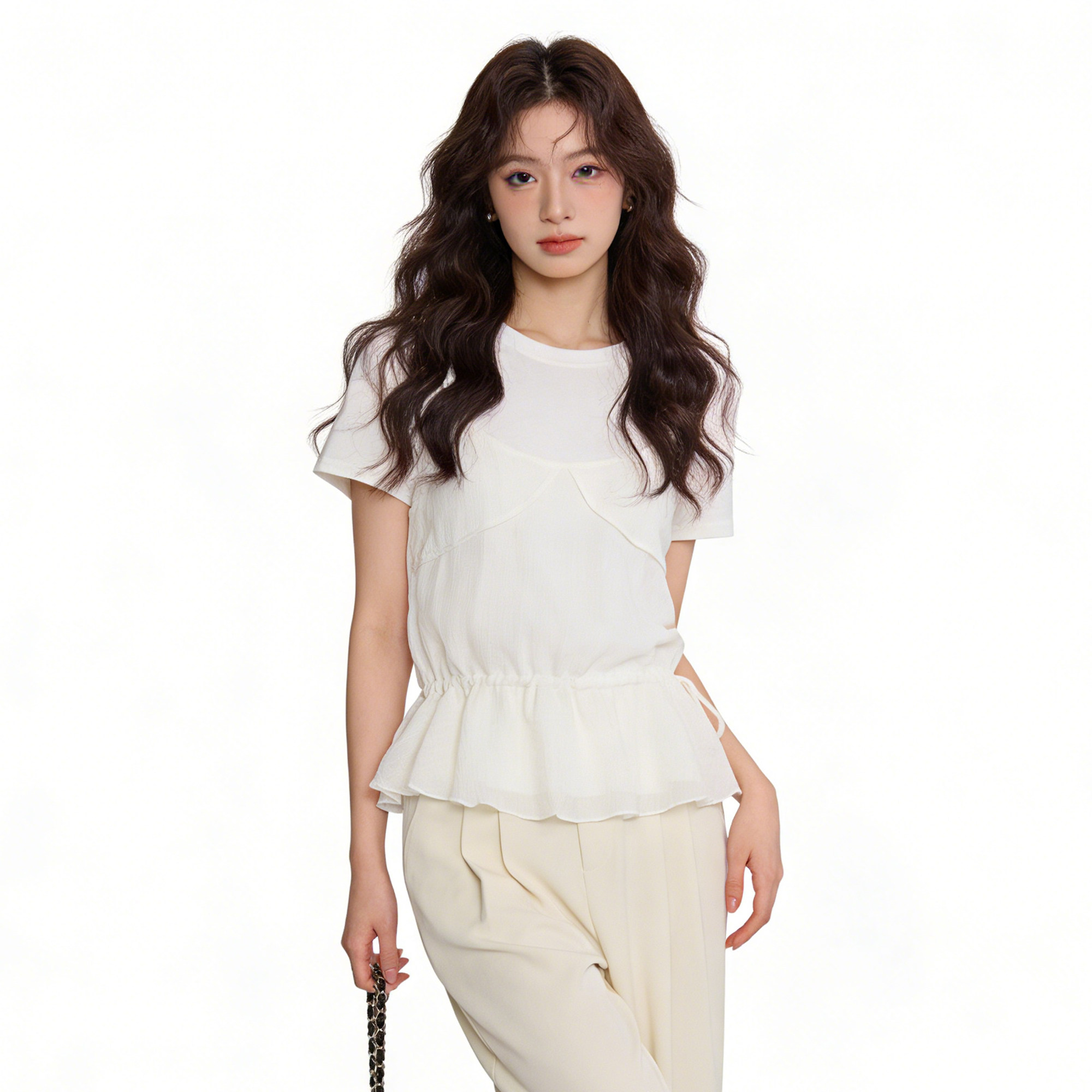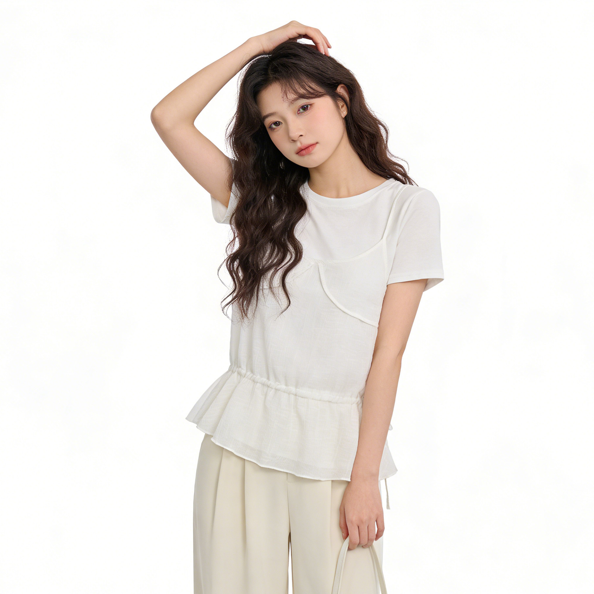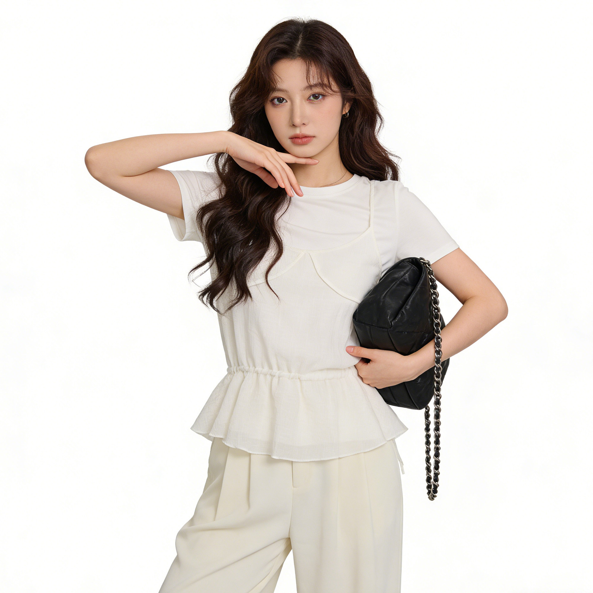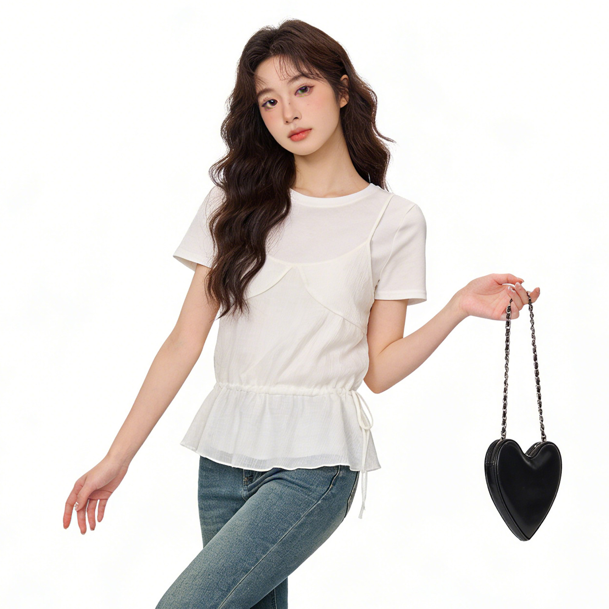 春夏季 时尚 百搭独特漂亮休闲圆领T恤叠穿吊带背心两件套装 女 新款由