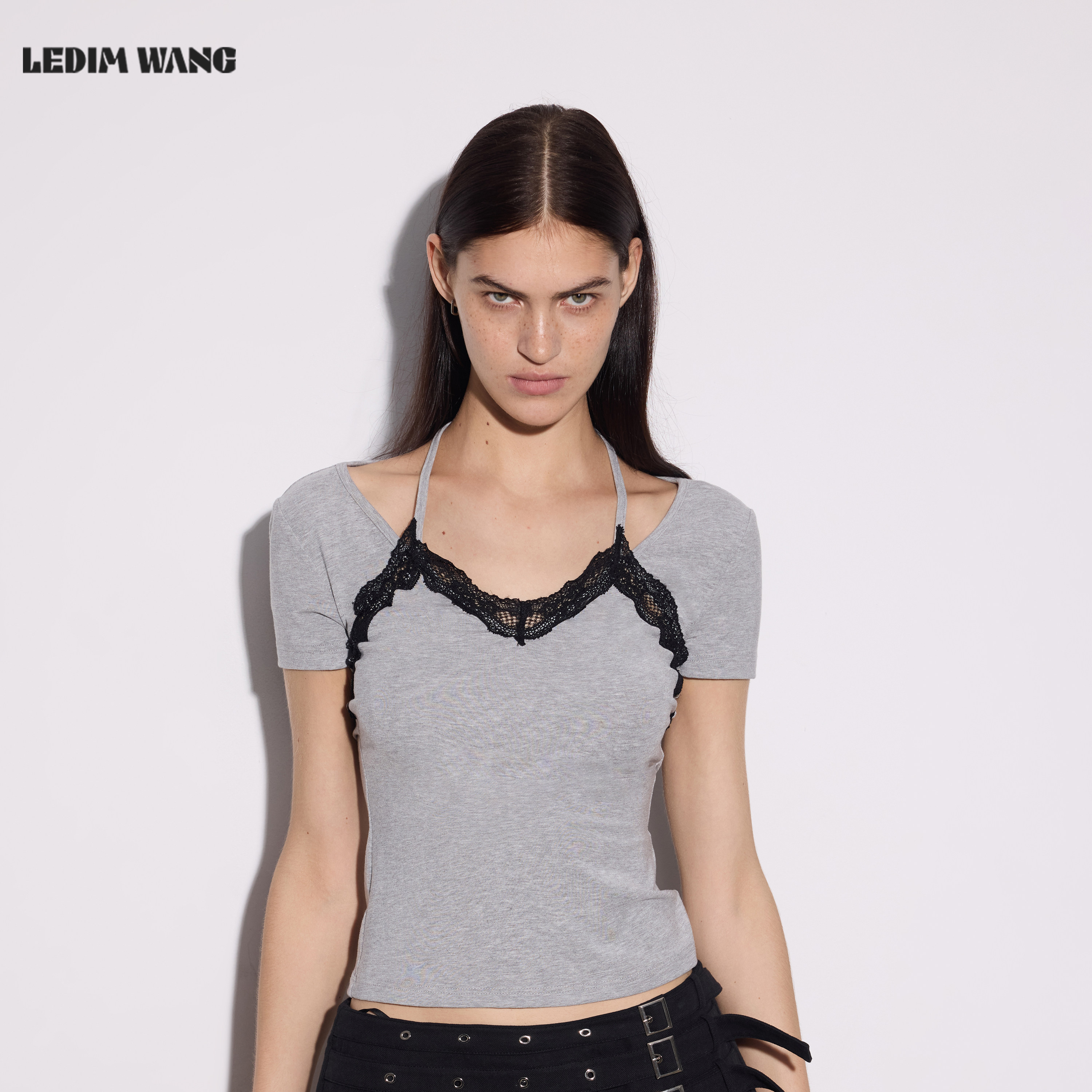 灰色短袖 显瘦挂脖上衣 WANG假两件蕾丝吊带T恤女26春夏新款 LEDIM由