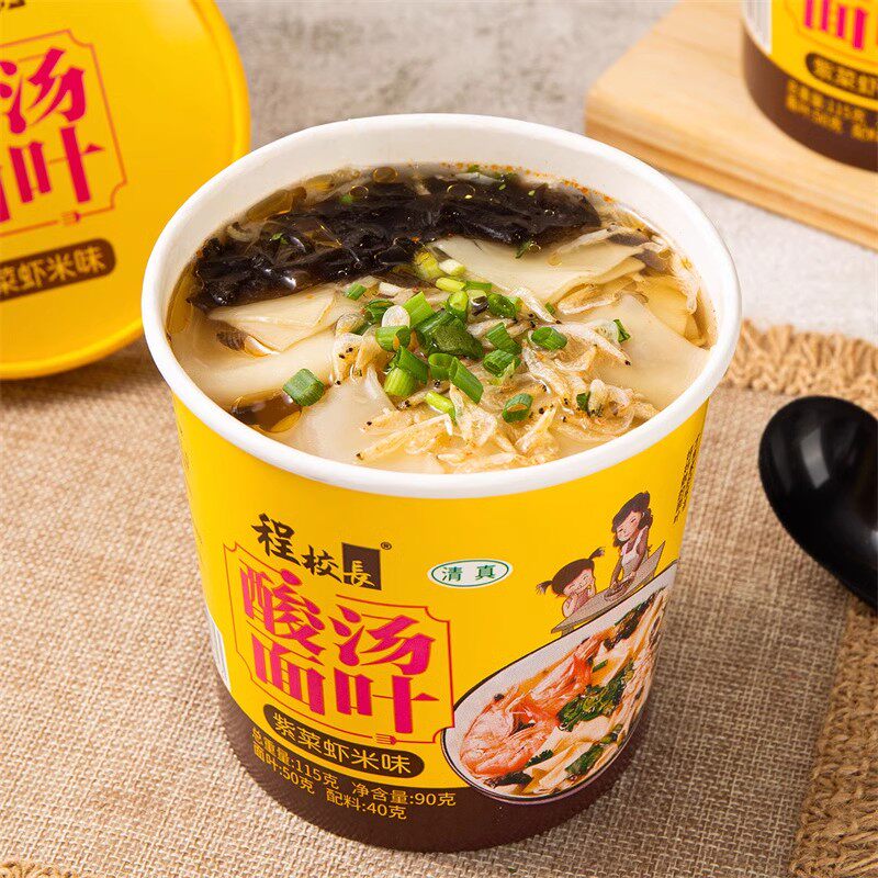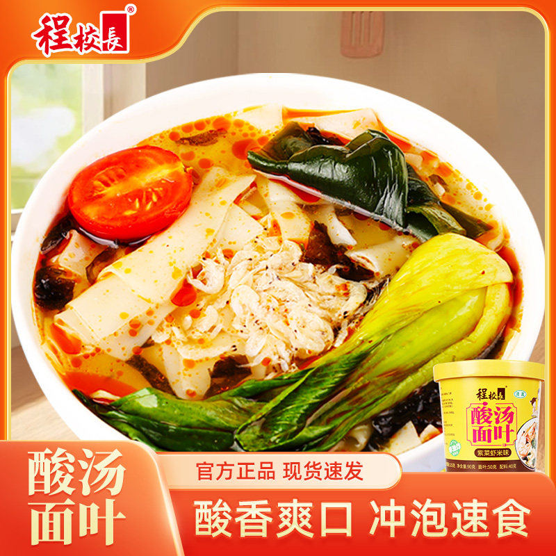 淘宝网为您提供商品清真速食非油炸紫菜虾米味面片冲泡免煮代餐 程校长酸汤面叶桶装的详细介绍,