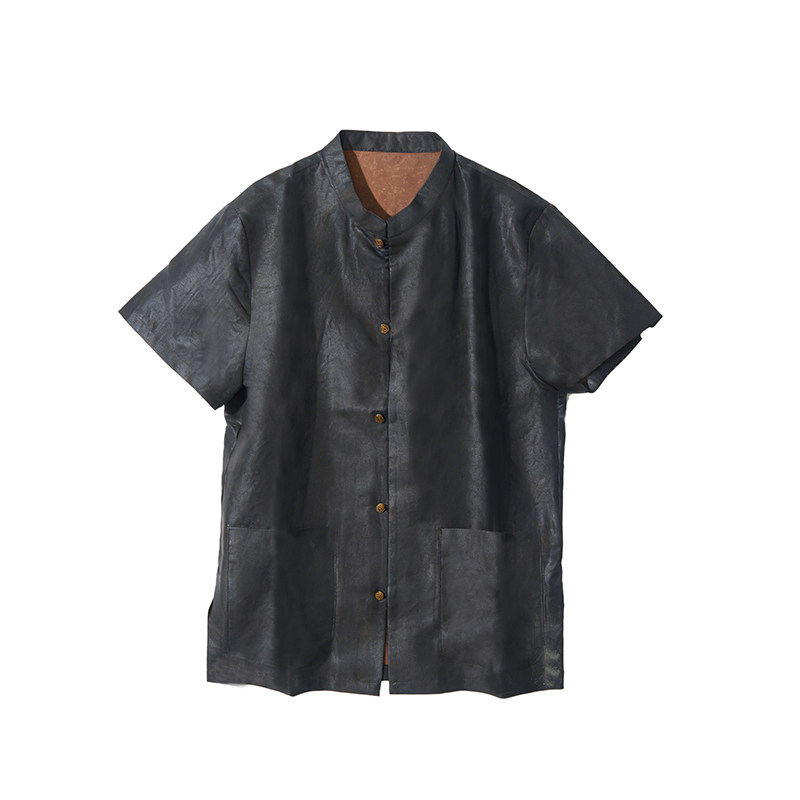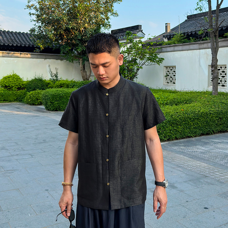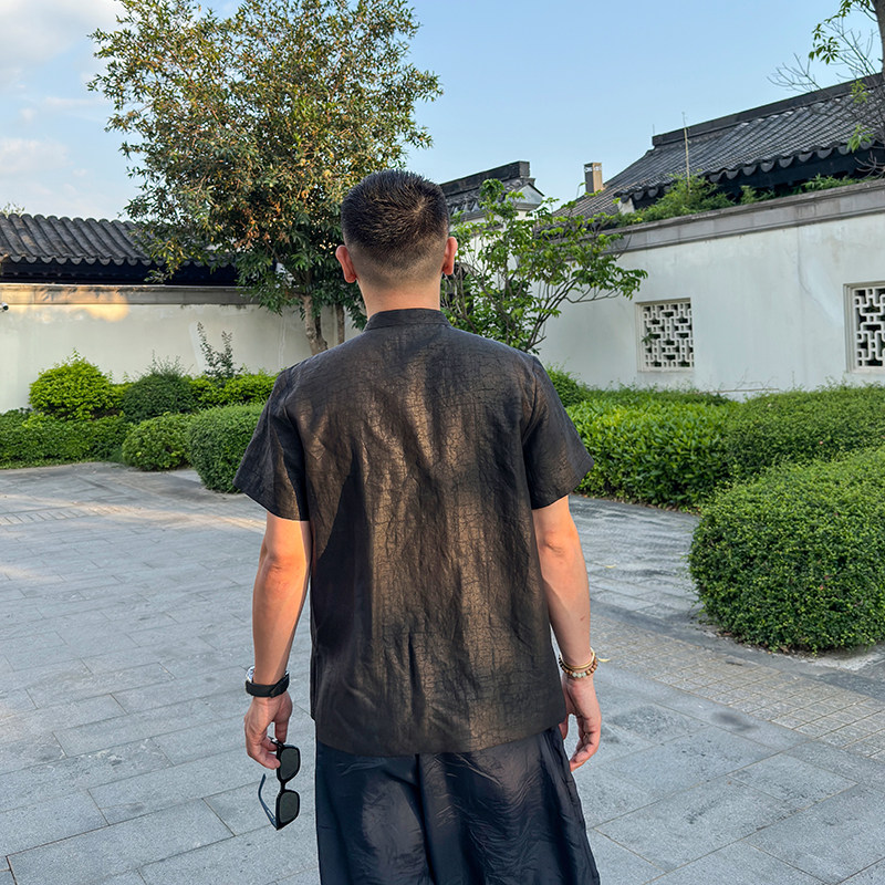 浮远三重门夏季 T恤唐装 上衣男款 高端桑蚕丝 龟裂纹真丝香云纱衬衫