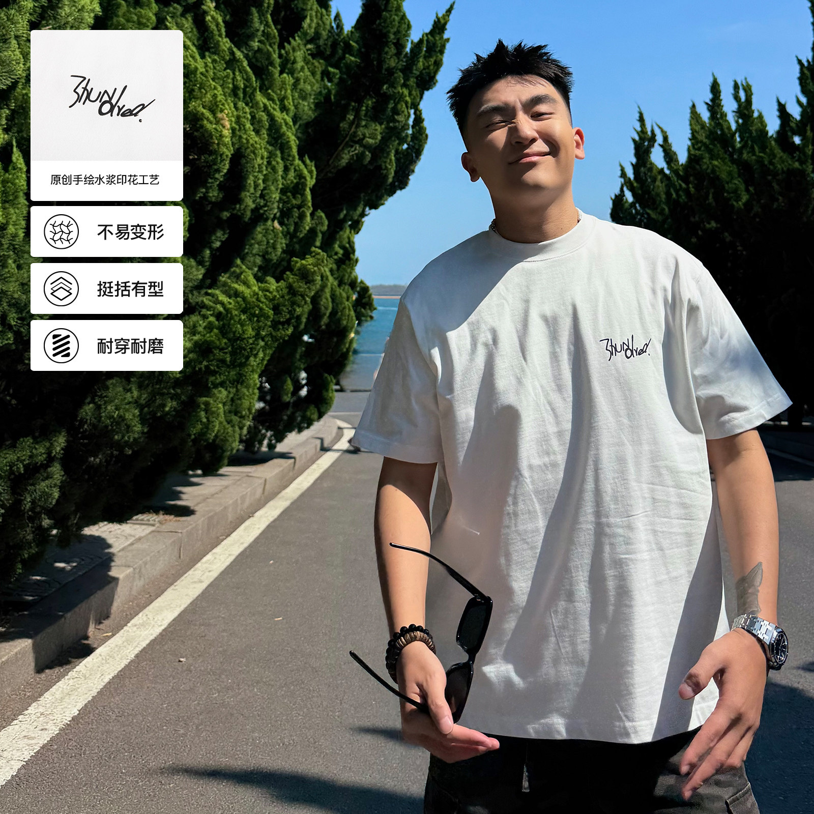 白色手绘纯棉短袖 SANBAI 叁佰 随性 圆领宽松休闲潮流T恤 男夏季由